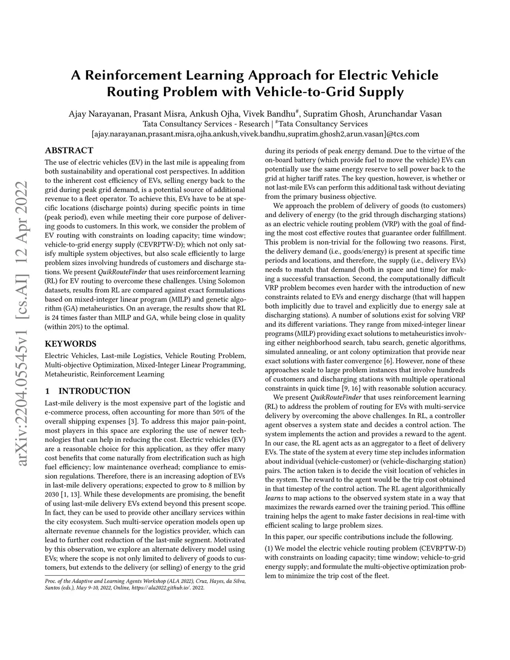 The use of electric vehicles (EV) in the last mile is appealing from both sustainability and operational cost perspectives. In addition to the inherent cost efficiency of EVs, selling energy back to the grid during peak grid demand, is a potential source of additional revenue to a fleet operator. To achieve this, EVs have to be at specific locations (discharge points) during specific points in time (peak period), even while meeting their core purpose of delivering goods to customers. In this work, we consider the problem of EV routing with constraints on loading capacity; time window; vehicle-to-grid energy supply (CEVRPTW-D); which not only satisfy multiple system objectives, but also scale efficiently to large problem sizes involving hundreds of customers and discharge stations. We present QuikRouteFinder that uses reinforcement learning (RL) for EV routing to overcome these challenges. Using Solomon datasets, results from RL are compared against exact formulations based on mixed-integer linear program (MILP) and genetic algorithm (GA) metaheuristics. On an average, the results show that RL is 24 times faster than MILP and GA, while being close in quality (within 20%) to the optimal.