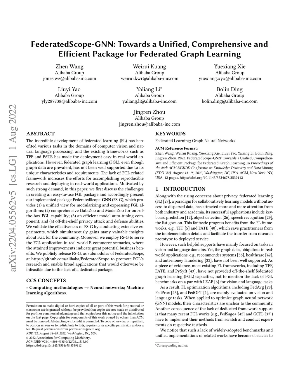 The incredible development of federated learning (FL) has benefited various tasks in the domains of computer vision and natural language processing, and the existing frameworks such as TFF and FATE has made the deployment easy in real-world applications. However, federated graph learning (FGL), even though graph data are prevalent, has not been well supported due to its unique characteristics and requirements. The lack of FGL-related framework increases the efforts for accomplishing reproducible research and deploying in real-world applications. Motivated by such strong demand, in this paper, we first discuss the challenges in creating an easy-to-use FGL package and accordingly present our implemented package FederatedScope-GNN (FS-G), which provides (1) a unified view for modularizing and expressing FGL algorithms; (2) comprehensive DataZoo and ModelZoo for out-of-the-box FGL capability; (3) an efficient model auto-tuning component; and (4) off-the-shelf privacy attack and defense abilities. We validate the effectiveness of FS-G by conducting extensive experiments, which simultaneously gains many valuable insights about FGL for the community. Moreover, we employ FS-G to serve the FGL application in real-world E-commerce scenarios, where the attained improvements indicate great potential business benefits. We publicly release FS-G, as submodules of FederatedScope, at https://github.com/alibaba/FederatedScope to promote FGL's research and enable broad applications that would otherwise be infeasible due to the lack of a dedicated package.