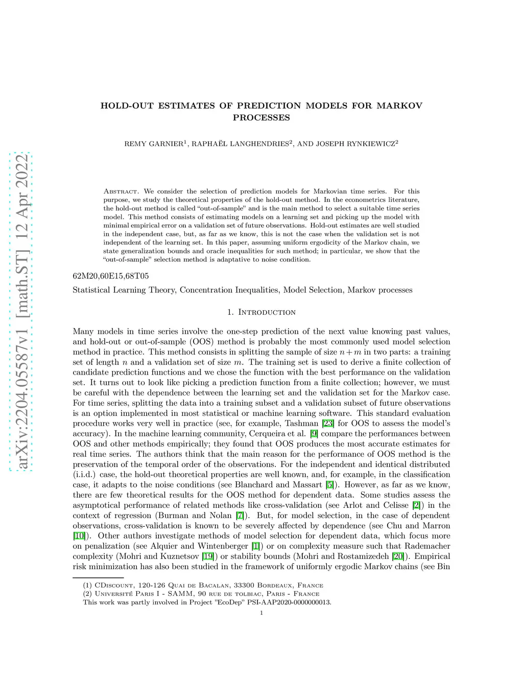 We consider the selection of prediction models for Markovian time series. For this purpose, we study the theoretical properties of the hold-out method. In the econometrics literature, the hold-out method is called out-of-sample and is the main method to select a suitable time series model. This method consists of estimating models on a learning set and picking up the model with minimal empirical error on a validation set of future observations. Hold-out estimates are well studied in the independent case, but, as far as we know, this is not the case when the validation set is not independent of the learning set. In this paper, assuming uniform ergodicity of the Markov chain, we state generalization bounds and oracle inequalities for such method; in particular, we show that the out-of-sample selection method is adaptative to noise condition.