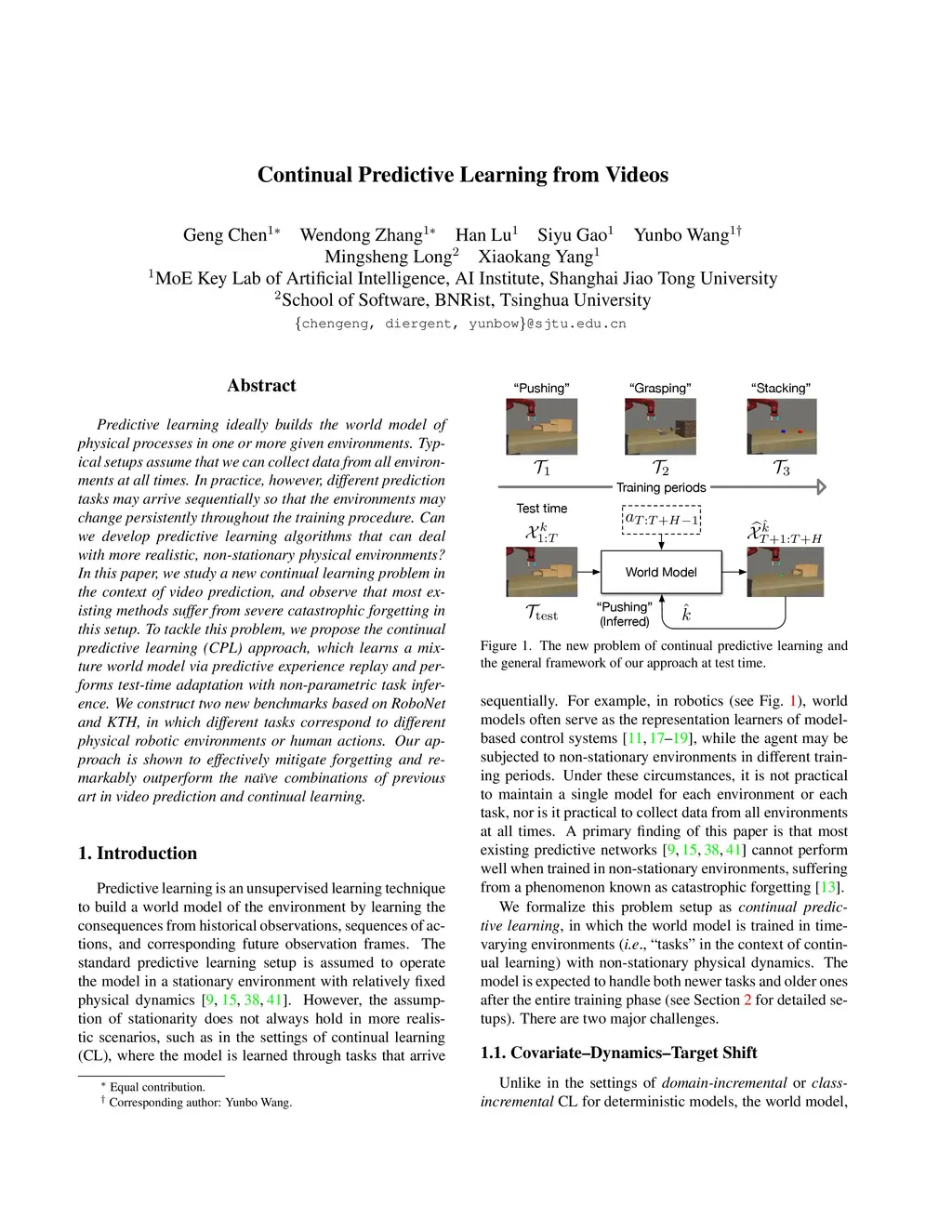 Predictive learning ideally builds the world model of physical processes in one or more given environments. Typical setups assume that we can collect data from all environments at all times. In practice, however, different prediction tasks may arrive sequentially so that the environments may change persistently throughout the training procedure. Can we develop predictive learning algorithms that can deal with more realistic, non-stationary physical environments? In this paper, we study a new continual learning problem in the context of video prediction, and observe that most existing methods suffer from severe catastrophic forgetting in this setup. To tackle this problem, we propose the continual predictive learning (CPL) approach, which learns a mixture world model via predictive experience replay and performs test-time adaptation with non-parametric task inference. We construct two new benchmarks based on RoboNet and KTH, in which different tasks correspond to different physical robotic environments or human actions. Our approach is shown to effectively mitigate forgetting and remarkably outperform the na\"ive combinations of previous art in video prediction and continual learning.