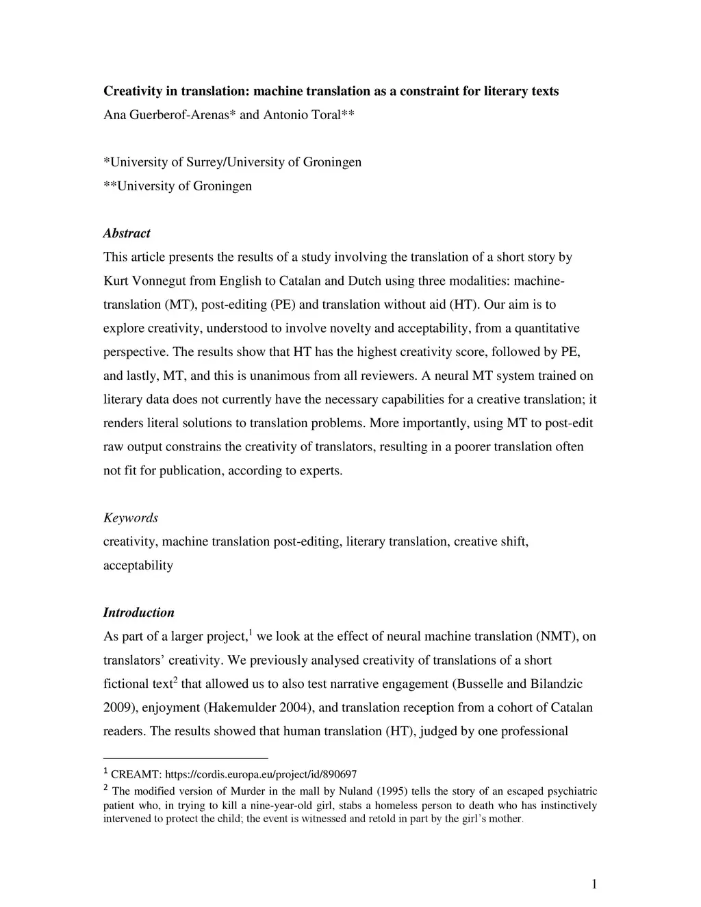 This article presents the results of a study involving the translation of a short story by Kurt Vonnegut from English to Catalan and Dutch using three modalities: machine-translation (MT), post-editing (PE) and translation without aid (HT). Our aim is to explore creativity, understood to involve novelty and acceptability, from a quantitative perspective. The results show that HT has the highest creativity score, followed by PE, and lastly, MT, and this is unanimous from all reviewers. A neural MT system trained on literary data does not currently have the necessary capabilities for a creative translation; it renders literal solutions to translation problems. More importantly, using MT to post-edit raw output constrains the creativity of translators, resulting in a poorer translation often not fit for publication, according to experts.