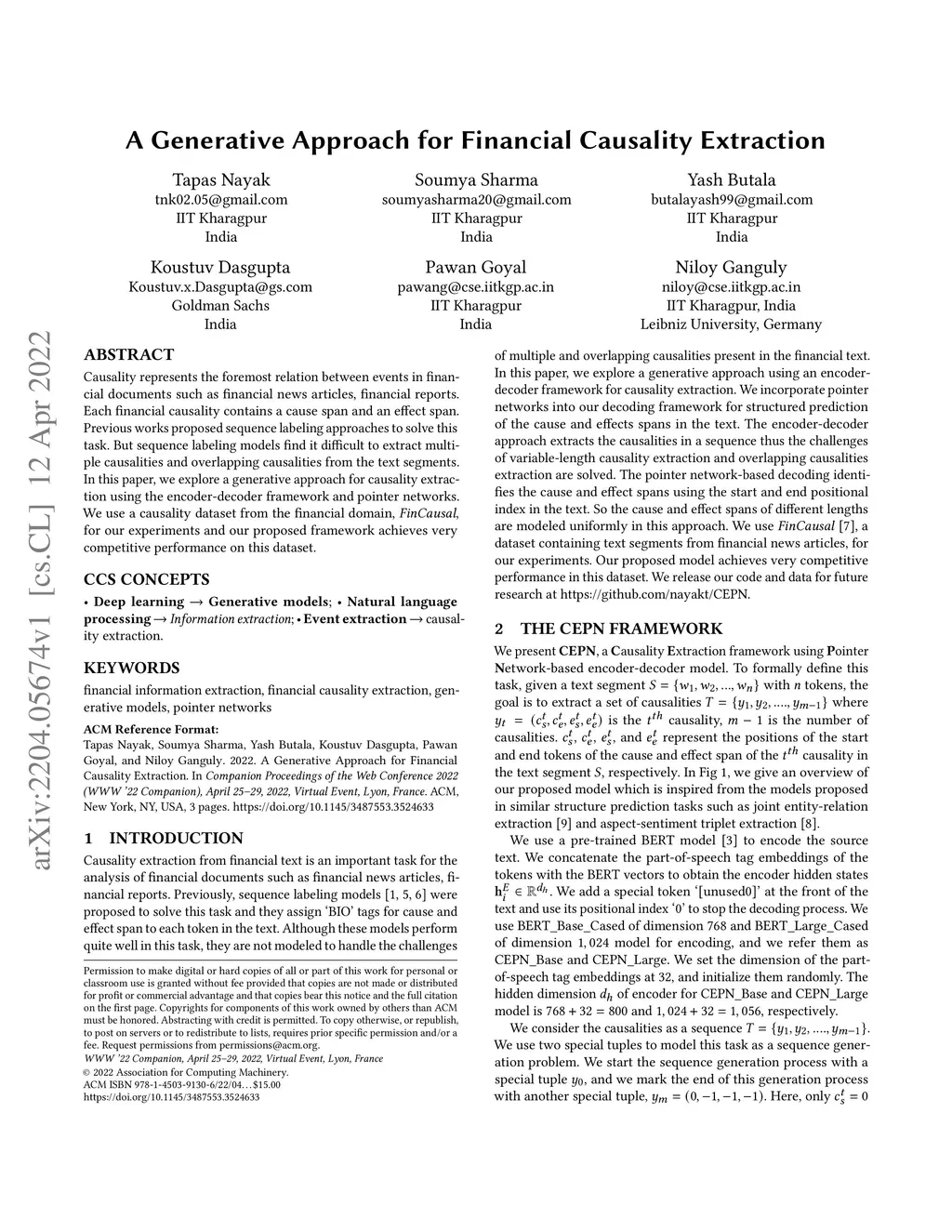 Causality represents the foremost relation between events in financial documents such as financial news articles, financial reports. Each financial causality contains a cause span and an effect span. Previous works proposed sequence labeling approaches to solve this task. But sequence labeling models find it difficult to extract multiple causalities and overlapping causalities from the text segments. In this paper, we explore a generative approach for causality extraction using the encoder-decoder framework and pointer networks. We use a causality dataset from the financial domain, \textit{FinCausal}, for our experiments and our proposed framework achieves very competitive performance on this dataset.