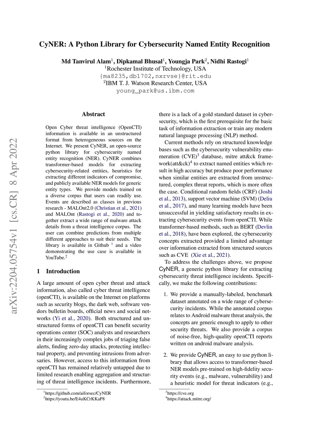 Open Cyber threat intelligence (OpenCTI) information is available in an unstructured format from heterogeneous sources on the Internet. We present CyNER, an open-source python library for cybersecurity named entity recognition (NER). CyNER combines transformer-based models for extracting cybersecurity-related entities, heuristics for extracting different indicators of compromise, and publicly available NER models for generic entity types. We provide models trained on a diverse corpus that users can readily use. Events are described as classes in previous research - MALOnt2.0 (Christian et al., 2021) and MALOnt (Rastogi et al., 2020) and together extract a wide range of malware attack details from a threat intelligence corpus. The user can combine predictions from multiple different approaches to suit their needs. The library is made publicly available.