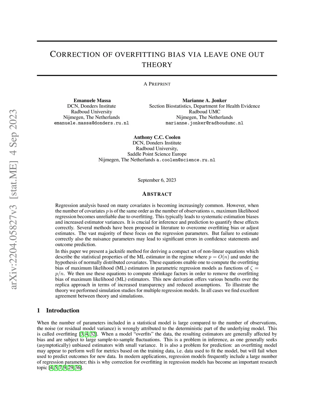 Regression analysis based on many covariates is becoming increasingly common. However, when the number of covariates is of the same order as the number of observations , maximum likelihood regression becomes unreliable due to overfitting. This typically leads to systematic estimation biases and increased estimator variances. It is crucial for inference and prediction to quantify these effects correctly. Several methods have been proposed in literature to overcome overfitting bias or adjust estimates. The vast majority of these focus on the regression parameters. But failure to estimate correctly also the nuisance parameters may lead to significant errors in confidence statements and outcome prediction. In this paper we present a jacknife method for deriving a compact set of non-linear equations which describe the statistical properties of the ML estimator in the regime where and under the hypothesis of normally distributed covariates. These equations enable one to compute the overfitting bias of maximum likelihood (ML) estimators in parametric regression models as functions of . We then use these equations to compute shrinkage factors in order to remove the overfitting bias of maximum likelihood (ML) estimators. This new derivation offers various benefits over the replica approach in terms of increased transparency and reduced assumptions. To illustrate the theory we performed simulation studies for multiple regression models. In all cases we find excellent agreement between theory and simulations.
