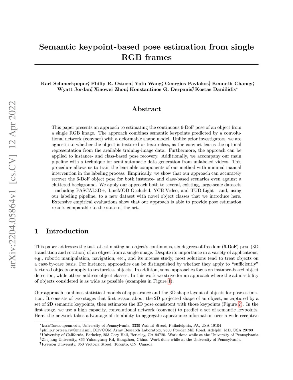This paper presents an approach to estimating the continuous 6-DoF pose of an object from a single RGB image. The approach combines semantic keypoints predicted by a convolutional network (convnet) with a deformable shape model. Unlike prior investigators, we are agnostic to whether the object is textured or textureless, as the convnet learns the optimal representation from the available training-image data. Furthermore, the approach can be applied to instance- and class-based pose recovery. Additionally, we accompany our main pipeline with a technique for semi-automatic data generation from unlabeled videos. This procedure allows us to train the learnable components of our method with minimal manual intervention in the labeling process. Empirically, we show that our approach can accurately recover the 6-DoF object pose for both instance- and class-based scenarios even against a cluttered background. We apply our approach both to several, existing, large-scale datasets - including PASCAL3D+, LineMOD-Occluded, YCB-Video, and TUD-Light - and, using our labeling pipeline, to a new dataset with novel object classes that we introduce here. Extensive empirical evaluations show that our approach is able to provide pose estimation results comparable to the state of the art.