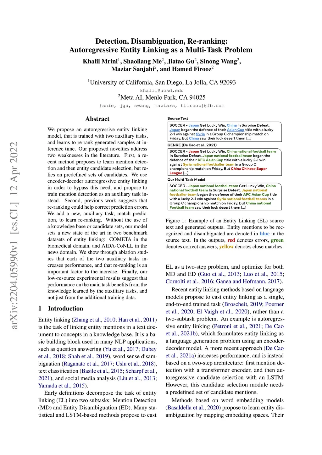 We propose an autoregressive entity linking model, that is trained with two auxiliary tasks, and learns to re-rank generated samples at inference time. Our proposed novelties address two weaknesses in the literature. First, a recent method proposes to learn mention detection and then entity candidate selection, but relies on predefined sets of candidates. We use encoder-decoder autoregressive entity linking in order to bypass this need, and propose to train mention detection as an auxiliary task instead. Second, previous work suggests that re-ranking could help correct prediction errors. We add a new, auxiliary task, match prediction, to learn re-ranking. Without the use of a knowledge base or candidate sets, our model sets a new state of the art in two benchmark datasets of entity linking: COMETA in the biomedical domain, and AIDA-CoNLL in the news domain. We show through ablation studies that each of the two auxiliary tasks increases performance, and that re-ranking is an important factor to the increase. Finally, our low-resource experimental results suggest that performance on the main task benefits from the knowledge learned by the auxiliary tasks, and not just from the additional training data.