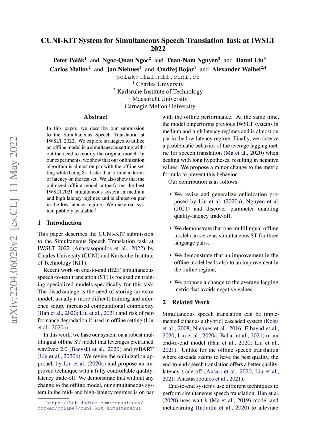 CUNI-KIT System for Simultaneous Speech Translation Task at IWSLT 2022