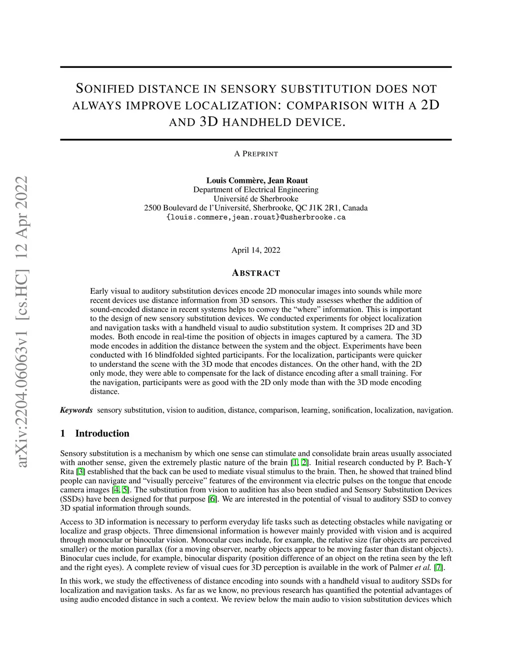 Early visual to auditory substitution devices encode 2D monocular images into sounds while more recent devices use distance information from 3D sensors. This study assesses whether the addition of sound-encoded distance in recent systems helps to convey the "where" information. This is important to the design of new sensory substitution devices. We conducted experiments for object localization and navigation tasks with a handheld visual to audio substitution system. It comprises 2D and 3D modes. Both encode in real-time the position of objects in images captured by a camera. The 3D mode encodes in addition the distance between the system and the object. Experiments have been conducted with 16 blindfolded sighted participants. For the localization, participants were quicker to understand the scene with the 3D mode that encodes distances. On the other hand, with the 2D only mode, they were able to compensate for the lack of distance encoding after a small training. For the navigation, participants were as good with the 2D only mode than with the 3D mode encoding distance.