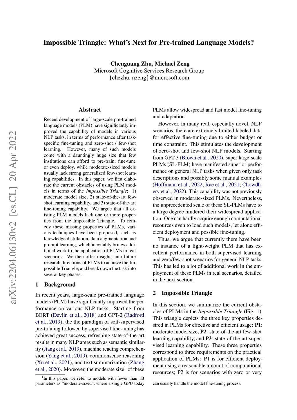 Recent development of large-scale pre-trained language models (PLM) have significantly improved the capability of models in various NLP tasks, in terms of performance after task-specific fine-tuning and zero-shot / few-shot learning. However, many of such models come with a dauntingly huge size that few institutions can afford to pre-train, fine-tune or even deploy, while moderate-sized models usually lack strong generalized few-shot learning capabilities. In this paper, we first elaborate the current obstacles of using PLM models in terms of the Impossible Triangle: 1) moderate model size, 2) state-of-the-art few-shot learning capability, and 3) state-of-the-art fine-tuning capability. We argue that all existing PLM models lack one or more properties from the Impossible Triangle. To remedy these missing properties of PLMs, various techniques have been proposed, such as knowledge distillation, data augmentation and prompt learning, which inevitably brings additional work to the application of PLMs in real scenarios. We then offer insights into future research directions of PLMs to achieve the Impossible Triangle, and break down the task into several key phases.