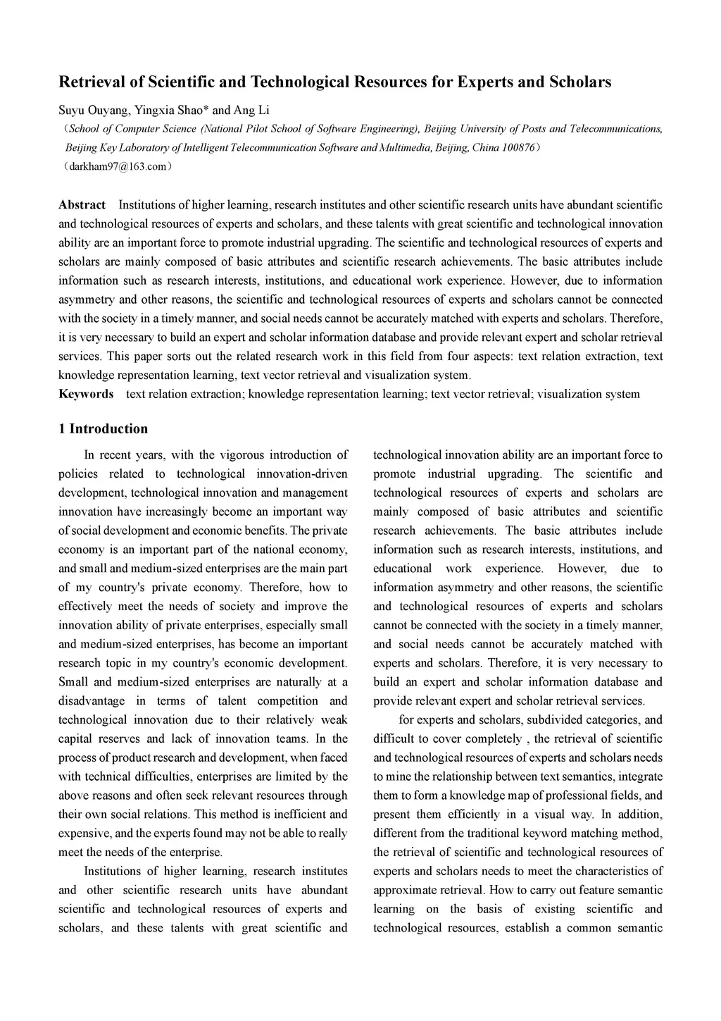 Institutions of higher learning, research institutes and other scientific research units have abundant scientific and technological resources of experts and scholars, and these talents with great scientific and technological innovation ability are an important force to promote industrial upgrading. The scientific and technological resources of experts and scholars are mainly composed of basic attributes and scientific research achievements. The basic attributes include information such as research interests, institutions, and educational work experience. However, due to information asymmetry and other reasons, the scientific and technological resources of experts and scholars cannot be connected with the society in a timely manner, and social needs cannot be accurately matched with experts and scholars. Therefore, it is very necessary to build an expert and scholar information database and provide relevant expert and scholar retrieval services. This paper sorts out the related research work in this field from four aspects: text relation extraction, text knowledge representation learning, text vector retrieval and visualization system.