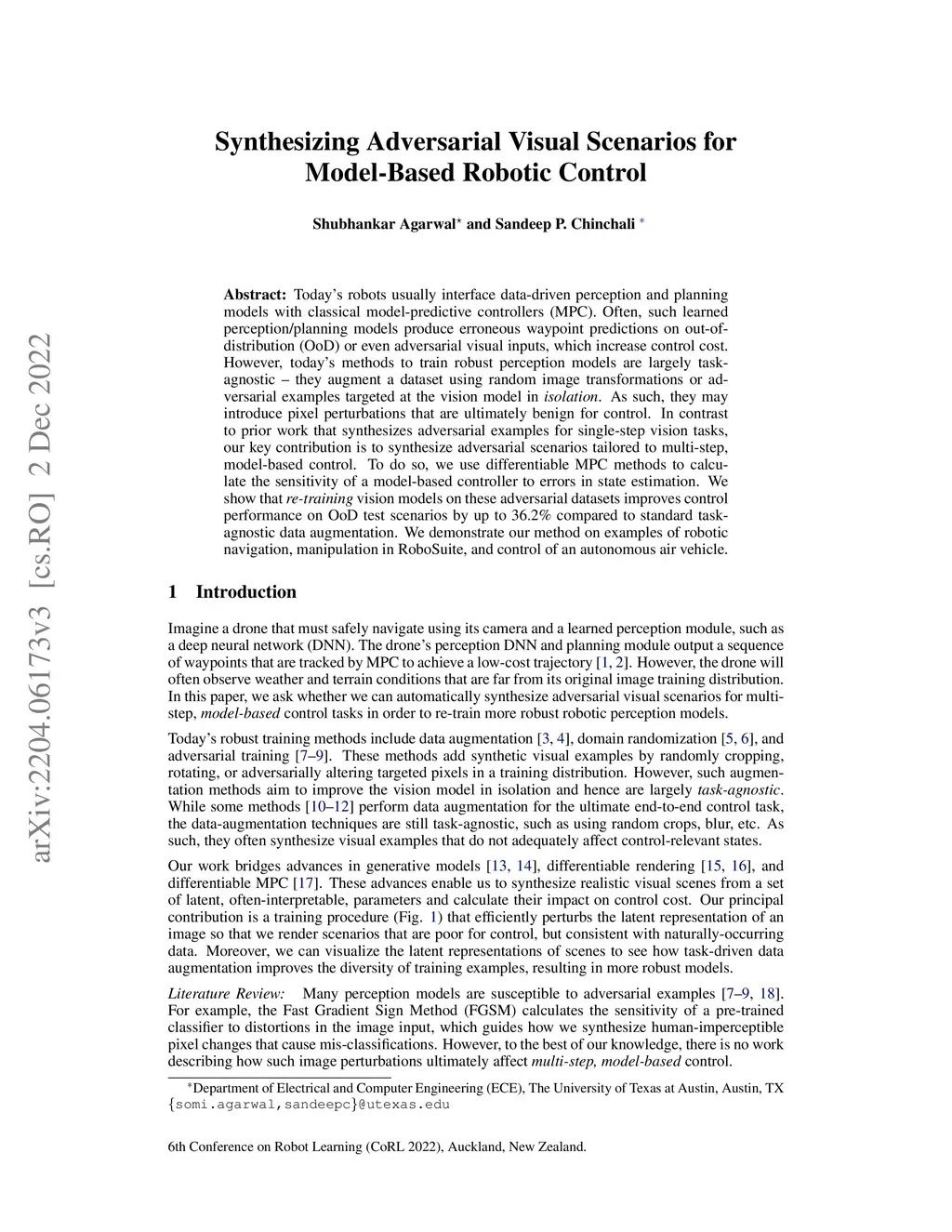 Today's robots often interface with data-driven perception and planning models with classical model-predictive controllers (MPC). Often, such learned perception/planning models produce erroneous waypoint predictions on out-of-distribution (OoD) or even adversarial visual inputs, which increase control costs. However, today's methods to train robust perception models are largely task-agnostic - they augment a dataset using random image transformations or adversarial examples targeted at the vision model in isolation. As such, they often introduce pixel perturbations that are ultimately benign for control. In contrast to prior work that synthesizes adversarial examples for single-step vision tasks, our key contribution is to synthesize adversarial scenarios tailored to multi-step, model-based control. To do so, we use differentiable MPC methods to calculate the sensitivity of a model-based controller to errors in state estimation. We show that re-training vision models on these adversarial datasets improves control performance on OoD test scenarios by up to 36.2% compared to standard task-agnostic data augmentation. We demonstrate our method on examples of robotic navigation, manipulation in RoboSuite, and control of an autonomous air vehicle.