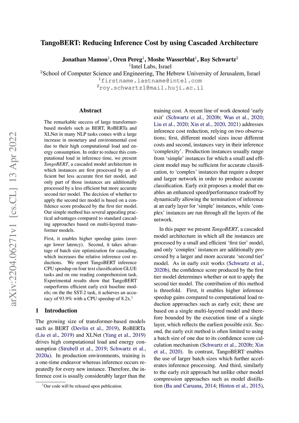 The remarkable success of large transformer-based models such as BERT, RoBERTa and XLNet in many NLP tasks comes with a large increase in monetary and environmental cost due to their high computational load and energy consumption. In order to reduce this computational load in inference time, we present TangoBERT, a cascaded model architecture in which instances are first processed by an efficient but less accurate first tier model, and only part of those instances are additionally processed by a less efficient but more accurate second tier model. The decision of whether to apply the second tier model is based on a confidence score produced by the first tier model. Our simple method has several appealing practical advantages compared to standard cascading approaches based on multi-layered transformer models. First, it enables higher speedup gains (average lower latency). Second, it takes advantage of batch size optimization for cascading, which increases the relative inference cost reductions. We report TangoBERT inference CPU speedup on four text classification GLUE tasks and on one reading comprehension task. Experimental results show that TangoBERT outperforms efficient early exit baseline models; on the the SST-2 task, it achieves an accuracy of 93.9% with a CPU speedup of 8.2x.