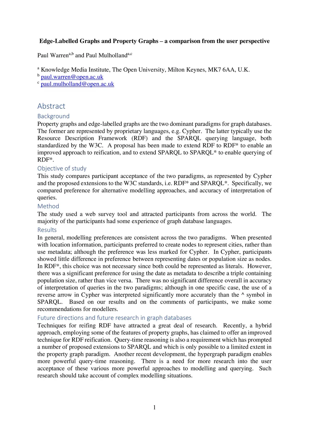 This study compares participant acceptance of the property graph and edge-labelled graph paradigms, as represented by Cypher and the proposed extensions to the W3C standards, RDF* and SPARQL*. In general, modelling preferences are consistent across the two paradigms. When presented with location information, participants preferred to create nodes to represent cities, rather than use metadata; although the preference was less marked for Cypher. In Cypher, participants showed little difference in preference between representing dates or population size as nodes. In RDF*, this choice was not necessary since both could be represented as literals. However, there was a significant preference for using the date as metadata to describe a triple containing population size, rather than vice versa. There was no significant difference overall in accuracy of interpretation of queries in the two paradigms; although in one specific case, the use of a reverse arrow in Cypher was interpreted significantly more accurately than the ^ symbol in SPARQL. Based on our results and on the comments of participants, we make some recommendations for modellers. Techniques for reifing RDF have attracted a great deal of research. Recently, a hybrid approach, employing some of the features of property graphs, has claimed to offer an improved technique for RDF reification. Query-time reasoning is also a requirement which has prompted a number of proposed extensions to SPARQL and which is only possible to a limited extent in the property graph paradigm. Another recent development, the hypergraph paradigm enables more powerful query-time reasoning. There is a need for more research into the user acceptance of these various more powerful approaches to modelling and querying. Such research should take account of complex modelling situations.