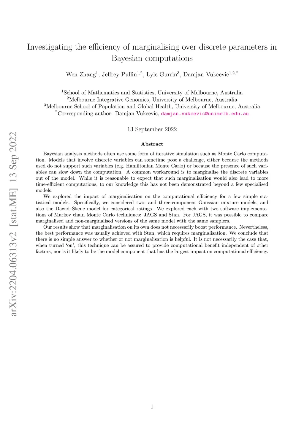 Bayesian analysis methods often use some form of iterative simulation such as Monte Carlo computation. Models that involve discrete variables can sometime pose a challenge, either because the methods used do not support such variables (e.g. Hamiltonian Monte Carlo) or because the presence of such variables can slow down the computation. A common workaround is to marginalise the discrete variables out of the model. While it is reasonable to expect that such marginalisation would also lead to more time-efficient computations, to our knowledge this has not been demonstrated beyond a few specialised models. We explored the impact of marginalisation on the computational efficiency for a few simple statistical models. Specifically, we considered two- and three-component Gaussian mixture models, and also the Dawid-Skene model for categorical ratings. We explored each with two software implementations of Markov chain Monte Carlo techniques: JAGS and Stan. We directly compared marginalised and non-marginalised versions of the same model using the samplers on the same software. Our results show that marginalisation on its own does not necessarily boost performance. Nevertheless, the best performance was usually achieved with Stan, which requires marginalisation. We conclude that there is no simple answer to whether or not marginalisation is helpful. It is not necessarily the case that, when turned ón', this technique can be assured to provide computational benefit independent of other factors, nor is it likely to be the model component that has the largest impact on computational efficiency.