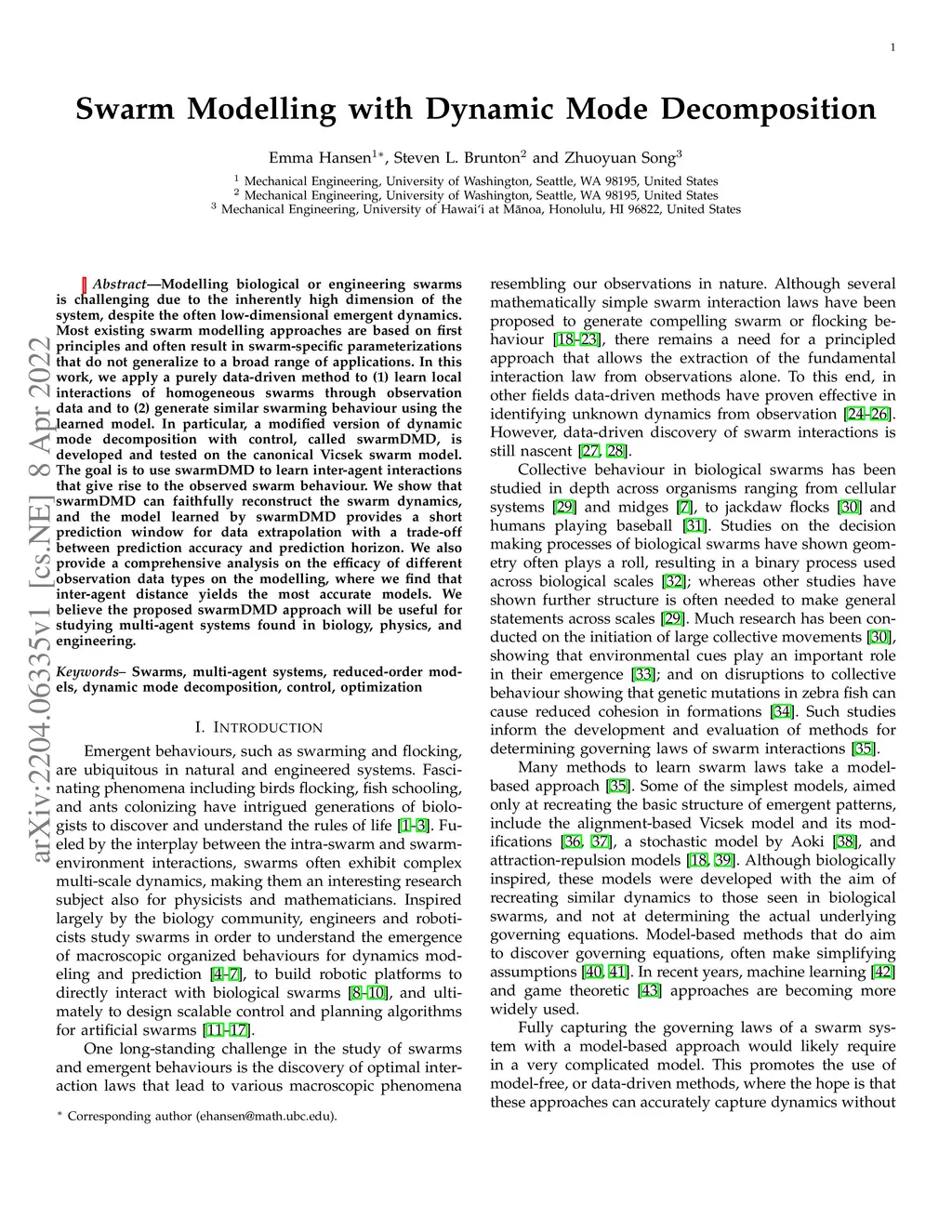 Modelling biological or engineering swarms is challenging due to the inherently high dimension of the system, despite the often low-dimensional emergent dynamics. Most existing swarm modelling approaches are based on first principles and often result in swarm-specific parameterizations that do not generalize to a broad range of applications. In this work, we apply a purely data-driven method to (1) learn local interactions of homogeneous swarms through observation data and to (2) generate similar swarming behaviour using the learned model. In particular, a modified version of dynamic mode decomposition with control, called swarmDMD, is developed and tested on the canonical Vicsek swarm model. The goal is to use swarmDMD to learn inter-agent interactions that give rise to the observed swarm behaviour. We show that swarmDMD can faithfully reconstruct the swarm dynamics, and the model learned by swarmDMD provides a short prediction window for data extrapolation with a trade-off between prediction accuracy and prediction horizon. We also provide a comprehensive analysis on the efficacy of different observation data types on the modelling, where we find that inter-agent distance yields the most accurate models. We believe the proposed swarmDMD approach will be useful for studying multi-agent systems found in biology, physics, and engineering.