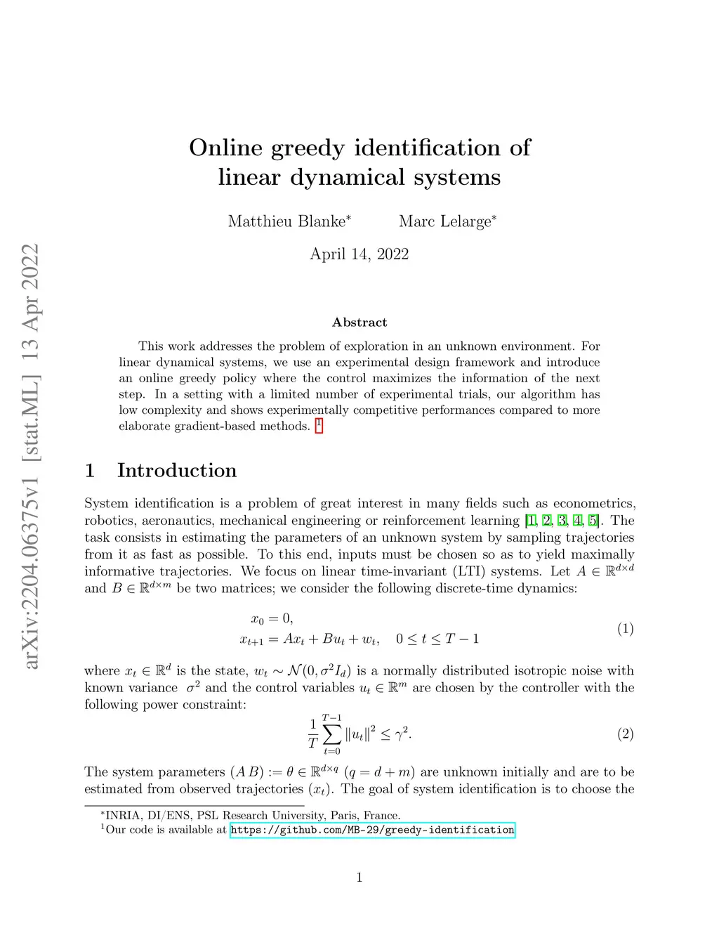 This work addresses the problem of exploration in an unknown environment. For linear dynamical systems, we use an experimental design framework and introduce an online greedy policy where the control maximizes the information of the next step. In a setting with a limited number of experimental trials, our algorithm has low complexity and shows experimentally competitive performances compared to more elaborate gradient-based methods.