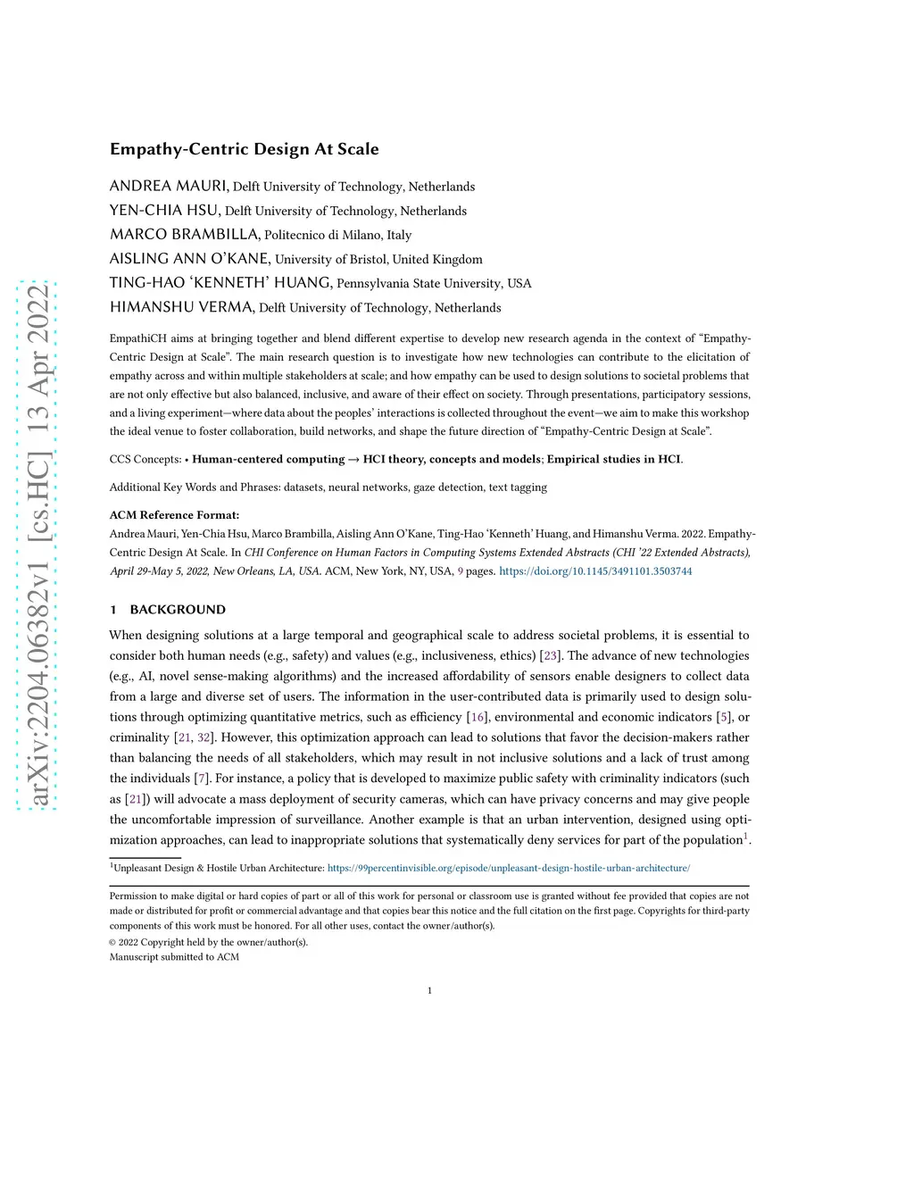 EmpathiCH aims at bringing together and blend different expertise to develop new research agenda in the context of "Empathy-Centric Design at Scale". The main research question is to investigate how new technologies can contribute to the elicitation of empathy across and within multiple stakeholders at scale; and how empathy can be used to design solutions to societal problems that are not only effective but also balanced, inclusive, and aware of their effect on society. Through presentations, participatory sessions, and a living experiment -- where data about the peoples' interactions is collected throughout the event -- we aim to make this workshop the ideal venue to foster collaboration, build networks, and shape the future direction of "Empathy-Centric Design at Scale".