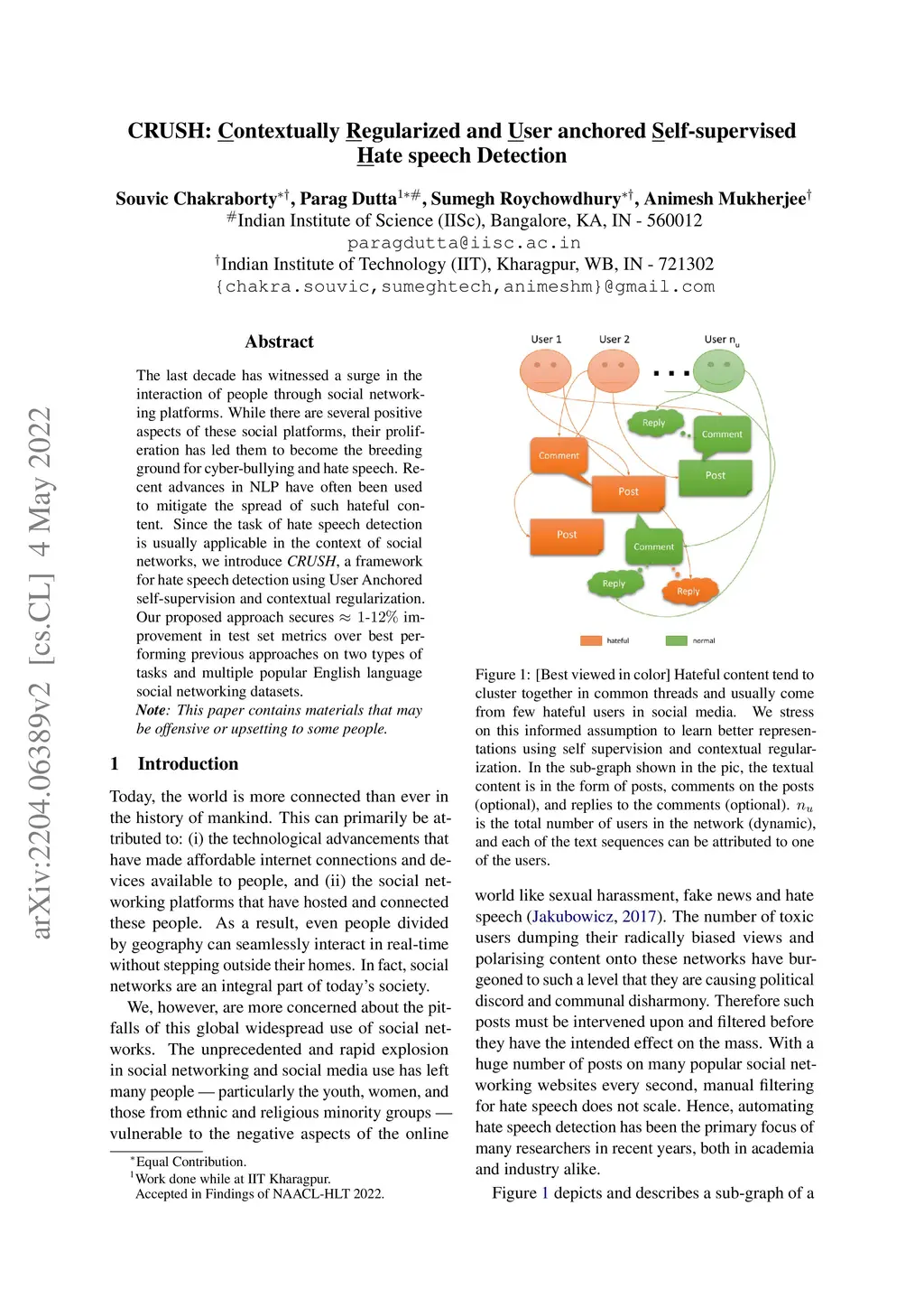 CRUSH: Contextually Regularized and User anchored Self-supervised Hate