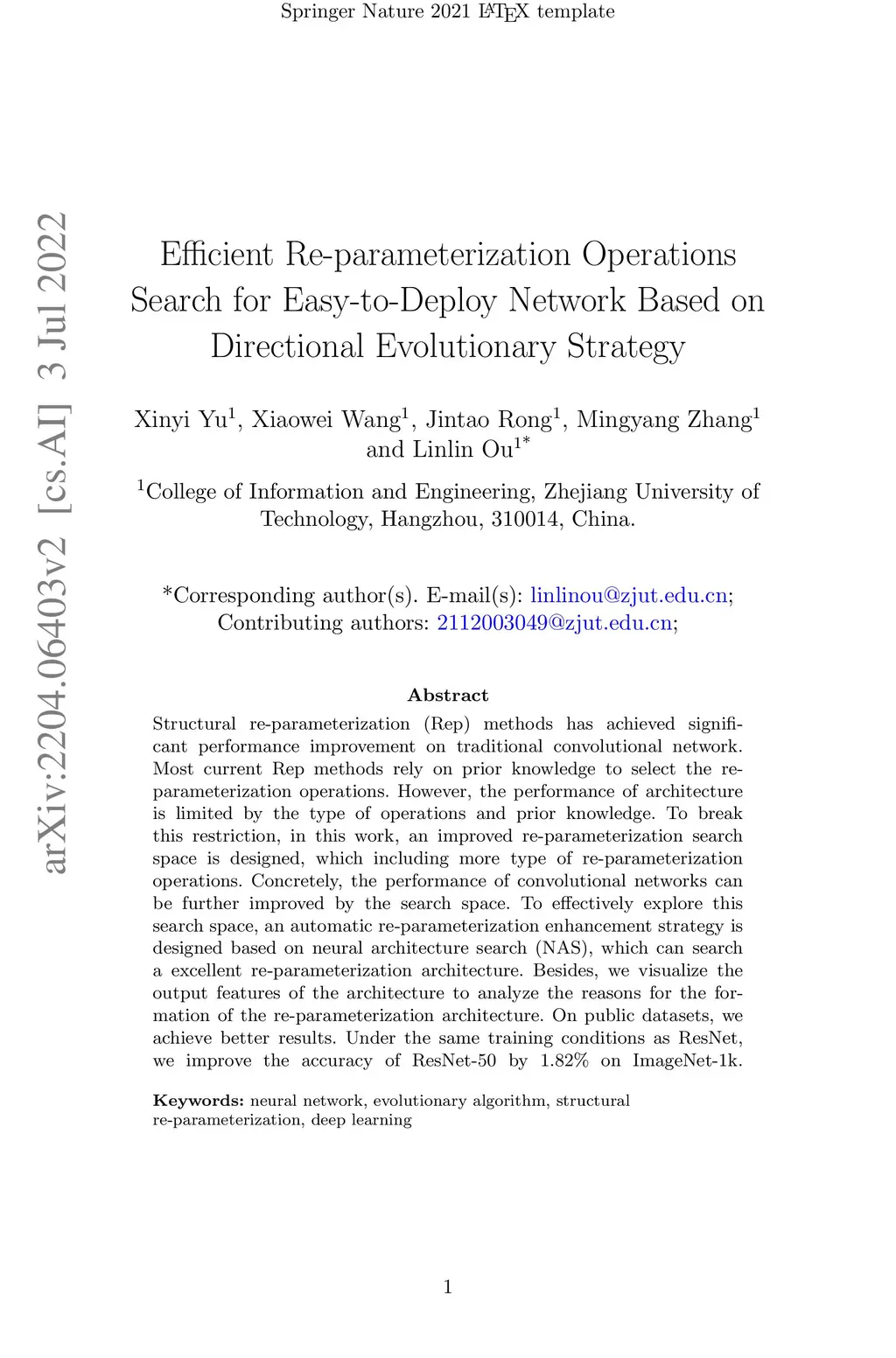 Structural re-parameterization (Rep) methods has achieved significant performance improvement on traditional convolutional network. Most current Rep methods rely on prior knowledge to select the reparameterization operations. However, the performance of architecture is limited by the type of operations and prior knowledge. To break this restriction, in this work, an improved re-parameterization search space is designed, which including more type of re-parameterization operations. Concretely, the performance of convolutional networks can be further improved by the search space. To effectively explore this search space, an automatic re-parameterization enhancement strategy is designed based on neural architecture search (NAS), which can search a excellent re-parameterization architecture. Besides, we visualize the output features of the architecture to analyze the reasons for the formation of the re-parameterization architecture. On public datasets, we achieve better results. Under the same training conditions as ResNet, we improve the accuracy of ResNet-50 by 1.82% on ImageNet-1k.