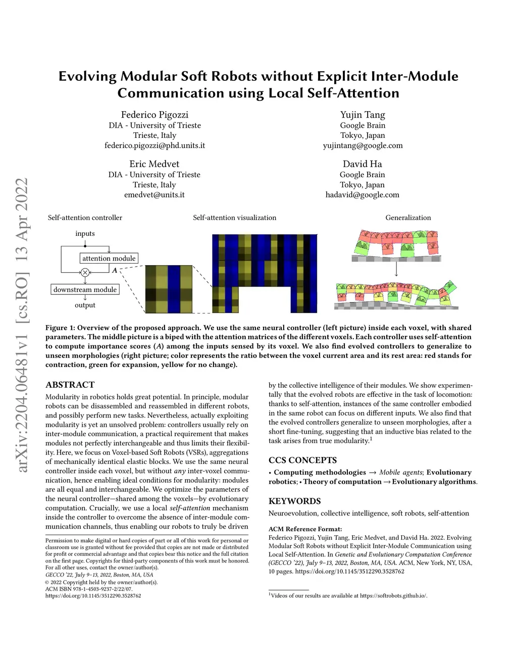 Modularity in robotics holds great potential. In principle, modular robots can be disassembled and reassembled in different robots, and possibly perform new tasks. Nevertheless, actually exploiting modularity is yet an unsolved problem: controllers usually rely on inter-module communication, a practical requirement that makes modules not perfectly interchangeable and thus limits their flexibility. Here, we focus on Voxel-based Soft Robots (VSRs), aggregations of mechanically identical elastic blocks. We use the same neural controller inside each voxel, but without any inter-voxel communication, hence enabling ideal conditions for modularity: modules are all equal and interchangeable. We optimize the parameters of the neural controller-shared among the voxels-by evolutionary computation. Crucially, we use a local self-attention mechanism inside the controller to overcome the absence of inter-module communication channels, thus enabling our robots to truly be driven by the collective intelligence of their modules. We show experimentally that the evolved robots are effective in the task of locomotion: thanks to self-attention, instances of the same controller embodied in the same robot can focus on different inputs. We also find that the evolved controllers generalize to unseen morphologies, after a short fine-tuning, suggesting that an inductive bias related to the task arises from true modularity.