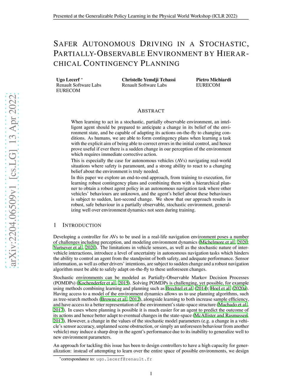 When learning to act in a stochastic, partially observable environment, an intelligent agent should be prepared to anticipate a change in its belief of the environment state, and be capable of adapting its actions on-the-fly to changing conditions. As humans, we are able to form contingency plans when learning a task with the explicit aim of being able to correct errors in the initial control, and hence prove useful if ever there is a sudden change in our perception of the environment which requires immediate corrective action. This is especially the case for autonomous vehicles (AVs) navigating real-world situations where safety is paramount, and a strong ability to react to a changing belief about the environment is truly needed. In this paper we explore an end-to-end approach, from training to execution, for learning robust contingency plans and combining them with a hierarchical planner to obtain a robust agent policy in an autonomous navigation task where other vehicles' behaviours are unknown, and the agent's belief about these behaviours is subject to sudden, last-second change. We show that our approach results in robust, safe behaviour in a partially observable, stochastic environment, generalizing well over environment dynamics not seen during training.