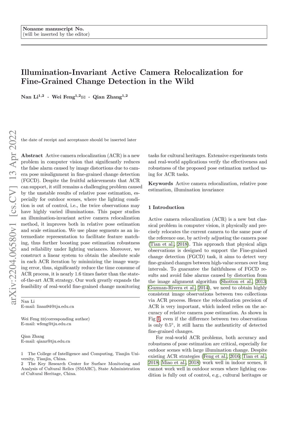 Active camera relocalization (ACR) is a new problem in computer vision that significantly reduces the false alarm caused by image distortions due to camera pose misalignment in fine-grained change detection (FGCD). Despite the fruitful achievements that ACR can support, it still remains a challenging problem caused by the unstable results of relative pose estimation, especially for outdoor scenes, where the lighting condition is out of control, i.e., the twice observations may have highly varied illuminations. This paper studies an illumination-invariant active camera relocalization method, it improves both in relative pose estimation and scale estimation. We use plane segments as an intermediate representation to facilitate feature matching, thus further boosting pose estimation robustness and reliability under lighting variances. Moreover, we construct a linear system to obtain the absolute scale in each ACR iteration by minimizing the image warping error, thus, significantly reduce the time consume of ACR process, it is nearly times faster than the state-of-the-art ACR strategy. Our work greatly expands the feasibility of real-world fine-grained change monitoring tasks for cultural heritages. Extensive experiments tests and real-world applications verify the effectiveness and robustness of the proposed pose estimation method using for ACR tasks.