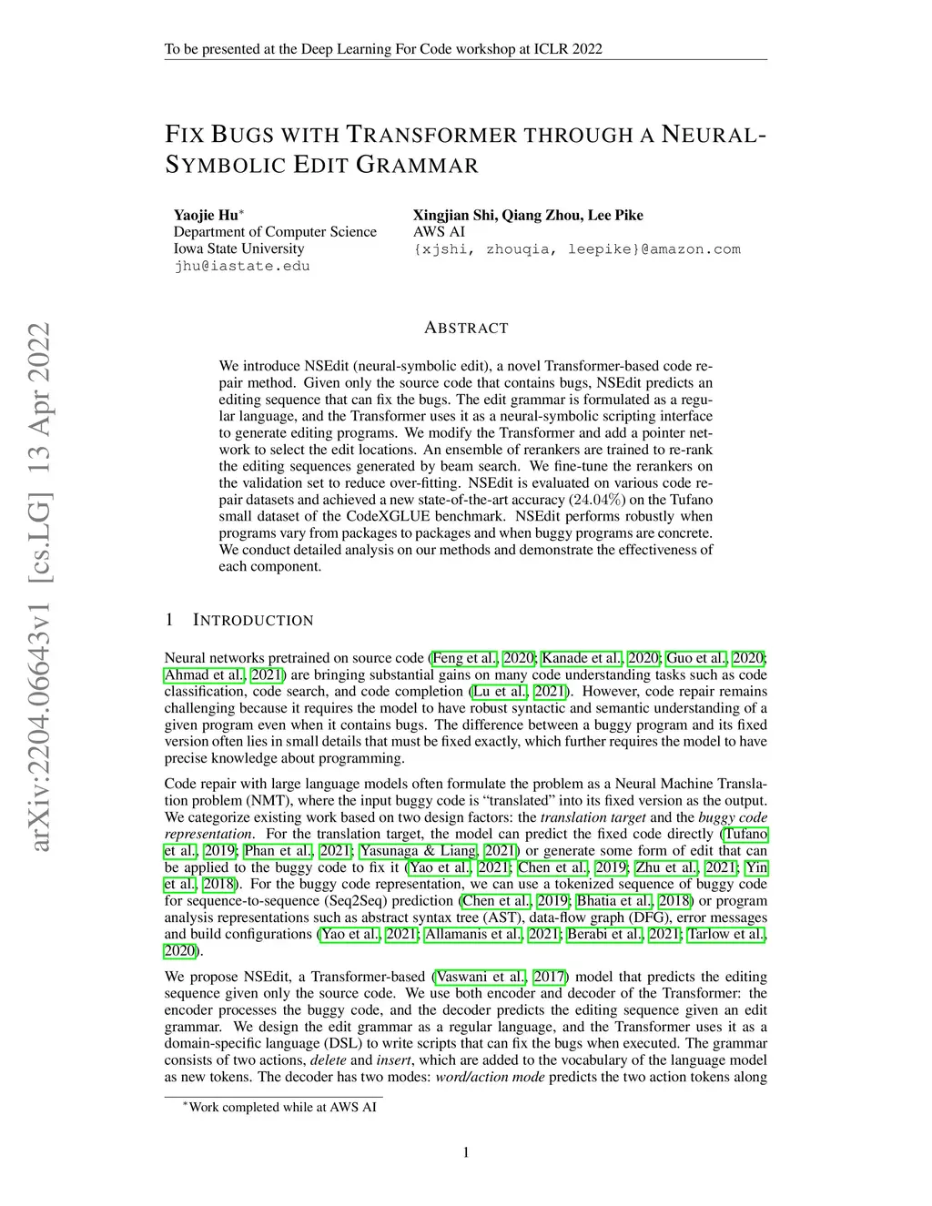 Fix Bugs with Transformer through a Neural-Symbolic Edit Grammar