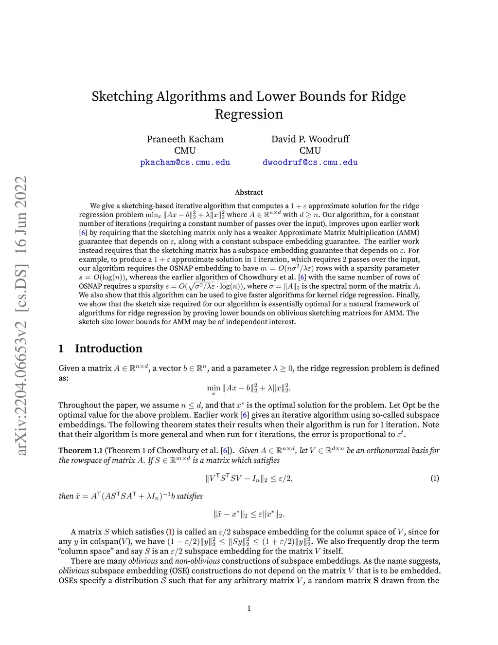Sketching Algorithms and Lower Bounds for Ridge Regression
