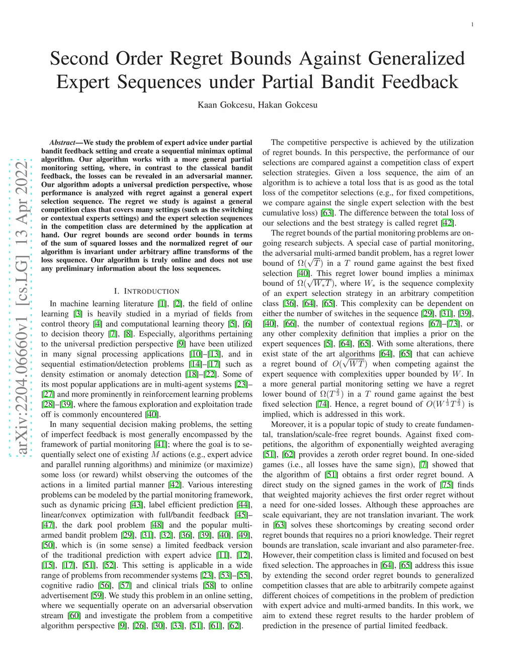 We study the problem of expert advice under partial bandit feedback setting and create a sequential minimax optimal algorithm. Our algorithm works with a more general partial monitoring setting, where, in contrast to the classical bandit feedback, the losses can be revealed in an adversarial manner. Our algorithm adopts a universal prediction perspective, whose performance is analyzed with regret against a general expert selection sequence. The regret we study is against a general competition class that covers many settings (such as the switching or contextual experts settings) and the expert selection sequences in the competition class are determined by the application at hand. Our regret bounds are second order bounds in terms of the sum of squared losses and the normalized regret of our algorithm is invariant under arbitrary affine transforms of the loss sequence. Our algorithm is truly online and does not use any preliminary information about the loss sequences.