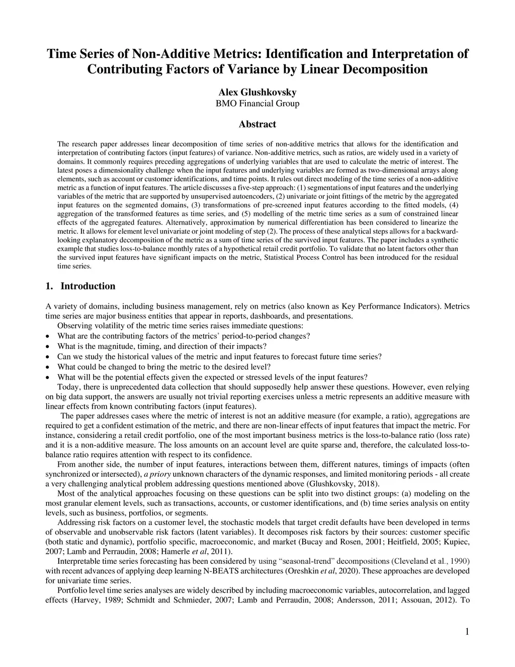 The research paper addresses linear decomposition of time series of non-additive metrics that allows for the identification and interpretation of contributing factors (input features) of variance. Non-additive metrics, such as ratios, are widely used in a variety of domains. It commonly requires preceding aggregations of underlying variables that are used to calculate the metric of interest. The latest poses a dimensionality challenge when the input features and underlying variables are formed as two-dimensional arrays along elements, such as account or customer identifications, and time points. It rules out direct modeling of the time series of a non-additive metric as a function of input features. The article discusses a five-step approach: (1) segmentations of input features and the underlying variables of the metric that are supported by unsupervised autoencoders, (2) univariate or joint fittings of the metric by the aggregated input features on the segmented domains, (3) transformations of pre-screened input features according to the fitted models, (4) aggregation of the transformed features as time series, and (5) modelling of the metric time series as a sum of constrained linear effects of the aggregated features. Alternatively, approximation by numerical differentiation has been considered to linearize the metric. It allows for element level univariate or joint modeling of step (2). The process of these analytical steps allows for a backward-looking explanatory decomposition of the metric as a sum of time series of the survived input features. The paper includes a synthetic example that studies loss-to-balance monthly rates of a hypothetical retail credit portfolio. To validate that no latent factors other than the survived input features have significant impacts on the metric, Statistical Process Control has been introduced for the residual time series.