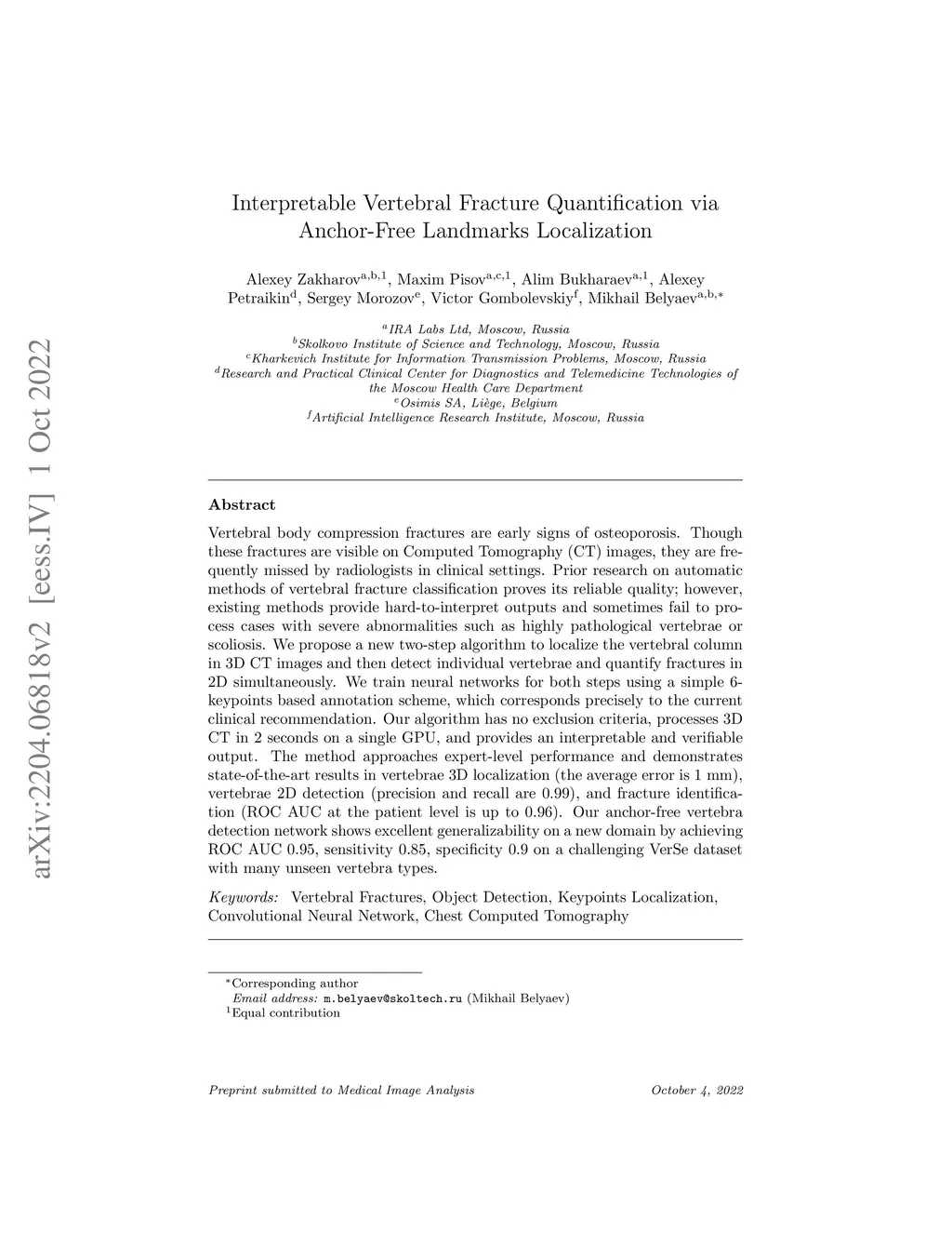 Vertebral body compression fractures are early signs of osteoporosis. Though these fractures are visible on Computed Tomography (CT) images, they are frequently missed by radiologists in clinical settings. Prior research on automatic methods of vertebral fracture classification proves its reliable quality; however, existing methods provide hard-to-interpret outputs and sometimes fail to process cases with severe abnormalities such as highly pathological vertebrae or scoliosis. We propose a new two-step algorithm to localize the vertebral column in 3D CT images and then detect individual vertebrae and quantify fractures in 2D simultaneously. We train neural networks for both steps using a simple 6-keypoints based annotation scheme, which corresponds precisely to the current clinical recommendation. Our algorithm has no exclusion criteria, processes 3D CT in 2 seconds on a single GPU, and provides an interpretable and verifiable output. The method approaches expert-level performance and demonstrates state-of-the-art results in vertebrae 3D localization (the average error is 1 mm), vertebrae 2D detection (precision and recall are 0.99), and fracture identification (ROC AUC at the patient level is up to 0.96). Our anchor-free vertebra detection network shows excellent generalizability on a new domain by achieving ROC AUC 0.95, sensitivity 0.85, specificity 0.9 on a challenging VerSe dataset with many unseen vertebra types.