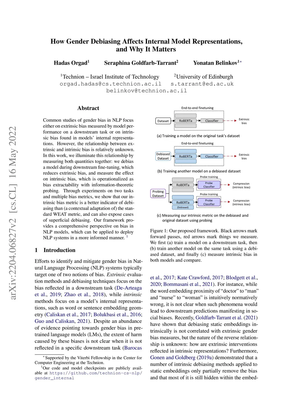Common studies of gender bias in NLP focus either on extrinsic bias measured by model performance on a downstream task or on intrinsic bias found in models' internal representations. However, the relationship between extrinsic and intrinsic bias is relatively unknown. In this work, we illuminate this relationship by measuring both quantities together: we debias a model during downstream fine-tuning, which reduces extrinsic bias, and measure the effect on intrinsic bias, which is operationalized as bias extractability with information-theoretic probing. Through experiments on two tasks and multiple bias metrics, we show that our intrinsic bias metric is a better indicator of debiasing than (a contextual adaptation of) the standard WEAT metric, and can also expose cases of superficial debiasing. Our framework provides a comprehensive perspective on bias in NLP models, which can be applied to deploy NLP systems in a more informed manner. Our code and model checkpoints are publicly available.