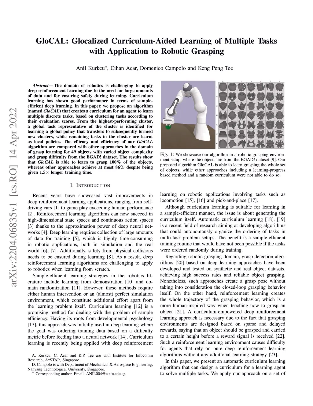 The domain of robotics is challenging to apply deep reinforcement learning due to the need for large amounts of data and for ensuring safety during learning. Curriculum learning has shown good performance in terms of sample- efficient deep learning. In this paper, we propose an algorithm (named GloCAL) that creates a curriculum for an agent to learn multiple discrete tasks, based on clustering tasks according to their evaluation scores. From the highest-performing cluster, a global task representative of the cluster is identified for learning a global policy that transfers to subsequently formed new clusters, while the remaining tasks in the cluster are learned as local policies. The efficacy and efficiency of our GloCAL algorithm are compared with other approaches in the domain of grasp learning for 49 objects with varied object complexity and grasp difficulty from the EGAD! dataset. The results show that GloCAL is able to learn to grasp 100% of the objects, whereas other approaches achieve at most 86% despite being given 1.5 times longer training time.