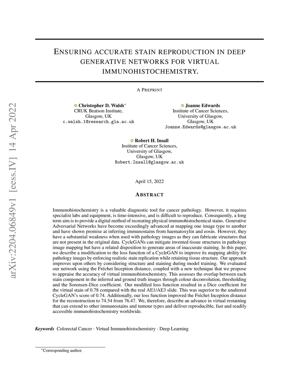 Immunohistochemistry is a valuable diagnostic tool for cancer pathology. However, it requires specialist labs and equipment, is time-intensive, and is difficult to reproduce. Consequently, a long term aim is to provide a digital method of recreating physical immunohistochemical stains. Generative Adversarial Networks have become exceedingly advanced at mapping one image type to another and have shown promise at inferring immunostains from haematoxylin and eosin. However, they have a substantial weakness when used with pathology images as they can fabricate structures that are not present in the original data. CycleGANs can mitigate invented tissue structures in pathology image mapping but have a related disposition to generate areas of inaccurate staining. In this paper, we describe a modification to the loss function of a CycleGAN to improve its mapping ability for pathology images by enforcing realistic stain replication while retaining tissue structure. Our approach improves upon others by considering structure and staining during model training. We evaluated our network using the Fr\échet Inception distance, coupled with a new technique that we propose to appraise the accuracy of virtual immunohistochemistry. This assesses the overlap between each stain component in the inferred and ground truth images through colour deconvolution, thresholding and the Sorensen-Dice coefficient. Our modified loss function resulted in a Dice coefficient for the virtual stain of 0.78 compared with the real AE1/AE3 slide. This was superior to the unaltered CycleGAN's score of 0.74. Additionally, our loss function improved the Fr\échet Inception distance for the reconstruction to 74.54 from 76.47. We, therefore, describe an advance in virtual restaining that can extend to other immunostains and tumour types and deliver reproducible, fast and readily accessible immunohistochemistry worldwide.