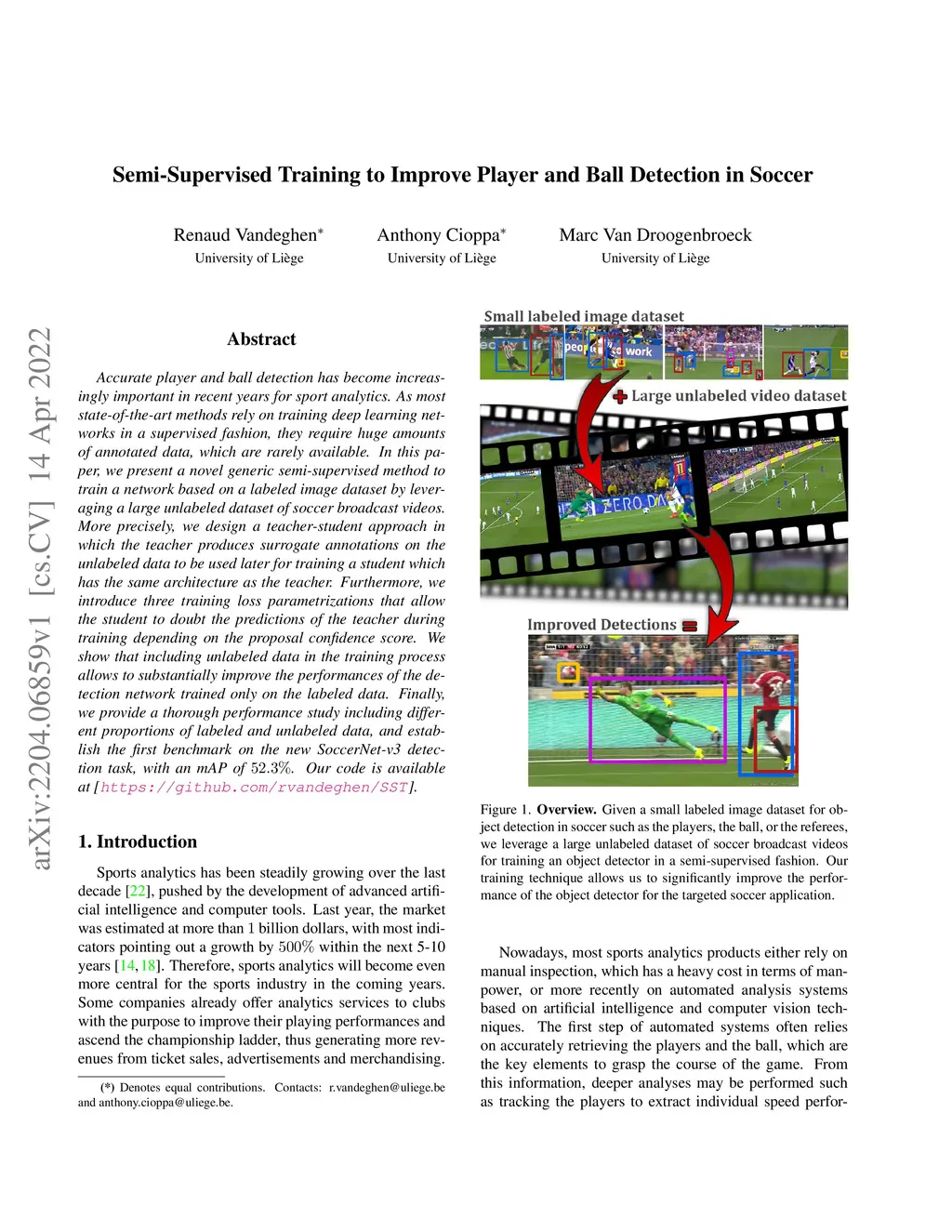 Accurate player and ball detection has become increasingly important in recent years for sport analytics. As most state-of-the-art methods rely on training deep learning networks in a supervised fashion, they require huge amounts of annotated data, which are rarely available. In this paper, we present a novel generic semi-supervised method to train a network based on a labeled image dataset by leveraging a large unlabeled dataset of soccer broadcast videos. More precisely, we design a teacher-student approach in which the teacher produces surrogate annotations on the unlabeled data to be used later for training a student which has the same architecture as the teacher. Furthermore, we introduce three training loss parametrizations that allow the student to doubt the predictions of the teacher during training depending on the proposal confidence score. We show that including unlabeled data in the training process allows to substantially improve the performances of the detection network trained only on the labeled data. Finally, we provide a thorough performance study including different proportions of labeled and unlabeled data, and establish the first benchmark on the new SoccerNet-v3 detection task, with an mAP of 52.3%. Our code is available at https://github.com/rvandeghen/SST .