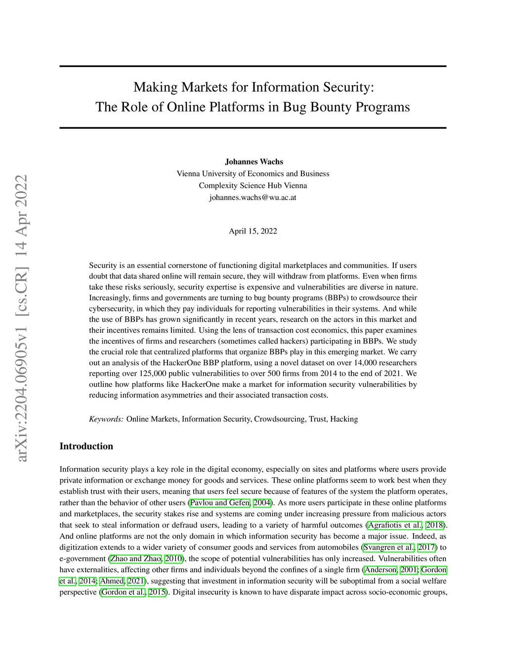 Security is an essential cornerstone of functioning digital marketplaces and communities. If users doubt that data shared online will remain secure, they will withdraw from platforms. Even when firms take these risks seriously, security expertise is expensive and vulnerabilities are diverse in nature. Increasingly, firms and governments are turning to bug bounty programs (BBPs) to crowdsource their cybersecurity, in which they pay individuals for reporting vulnerabilities in their systems. And while the use of BBPs has grown significantly in recent years, research on the actors in this market and their incentives remains limited. Using the lens of transaction cost economics, this paper examines the incentives of firms and researchers (sometimes called hackers) participating in BBPs. We study the crucial role that centralized platforms that organize BBPs play in this emerging market. We carry out an analysis of the HackerOne BBP platform, using a novel dataset on over 14,000 researchers reporting over 125,000 public vulnerabilities to over 500 firms from 2014 to the end of 2021. We outline how platforms like HackerOne make a market for information security vulnerabilities by reducing information asymmetries and their associated transaction costs.