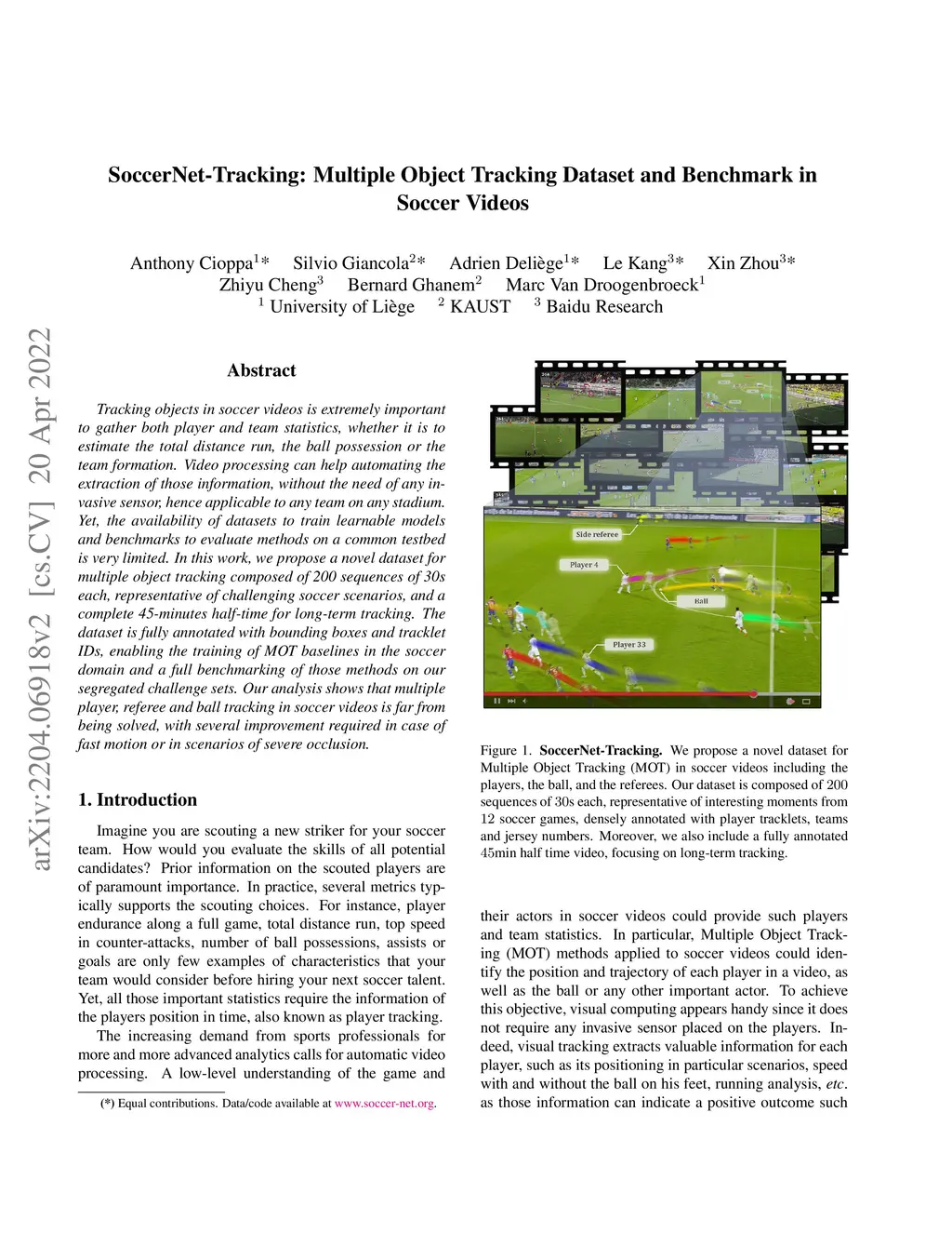 SoccerNet-Tracking: Multiple Object Tracking Dataset and Benchmark in