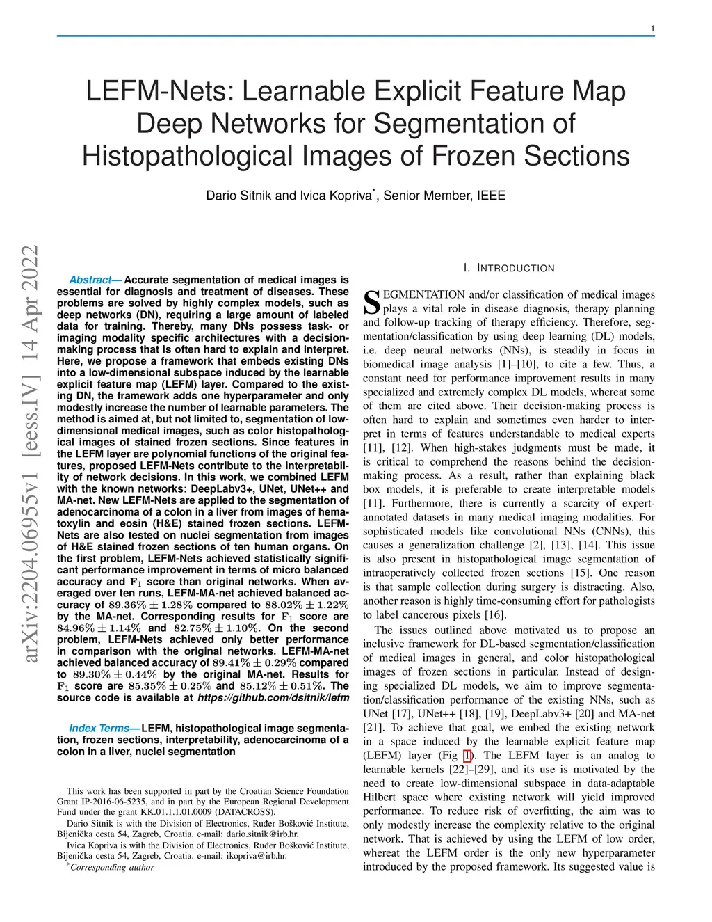 Accurate segmentation of medical images is essential for diagnosis and treatment of diseases. These problems are solved by highly complex models, such as deep networks (DN), requiring a large amount of labeled data for training. Thereby, many DNs possess task- or imaging modality specific architectures with a decision-making process that is often hard to explain and interpret. Here, we propose a framework that embeds existing DNs into a low-dimensional subspace induced by the learnable explicit feature map (LEFM) layer. Compared to the existing DN, the framework adds one hyperparameter and only modestly increase the number of learnable parameters. The method is aimed at, but not limited to, segmentation of low-dimensional medical images, such as color histopathological images of stained frozen sections. Since features in the LEFM layer are polynomial functions of the original features, proposed LEFM-Nets contribute to the interpretability of network decisions. In this work, we combined LEFM with the known networks: DeepLabv3+, UNet, UNet++ and MA-net. New LEFM-Nets are applied to the segmentation of adenocarcinoma of a colon in a liver from images of hematoxylin and eosin (H&E) stained frozen sections. LEFM-Nets are also tested on nuclei segmentation from images of H&E stained frozen sections of ten human organs. On the first problem, LEFM-Nets achieved statistically significant performance improvement in terms of micro balanced accuracy and score than original networks. LEFM-Nets achieved only better performance in comparison with the original networks on the second problem. The source code is available at https://github.com/dsitnik/lefm.