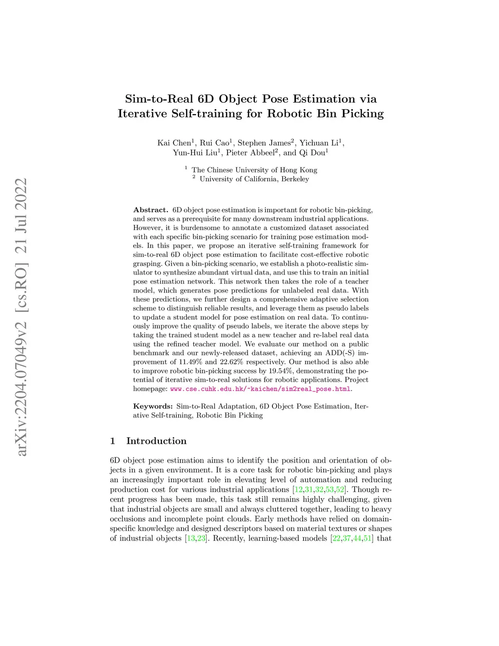 In this paper, we propose an iterative self-training framework for sim-to-real 6D object pose estimation to facilitate cost-effective robotic grasping. Given a bin-picking scenario, we establish a photo-realistic simulator to synthesize abundant virtual data, and use this to train an initial pose estimation network. This network then takes the role of a teacher model, which generates pose predictions for unlabeled real data. With these predictions, we further design a comprehensive adaptive selection scheme to distinguish reliable results, and leverage them as pseudo labels to update a student model for pose estimation on real data. To continuously improve the quality of pseudo labels, we iterate the above steps by taking the trained student model as a new teacher and re-label real data using the refined teacher model. We evaluate our method on a public benchmark and our newly-released dataset, achieving an ADD(-S) improvement of 11.49% and 22.62% respectively. Our method is also able to improve robotic bin-picking success by 19.54%, demonstrating the potential of iterative sim-to-real solutions for robotic applications.