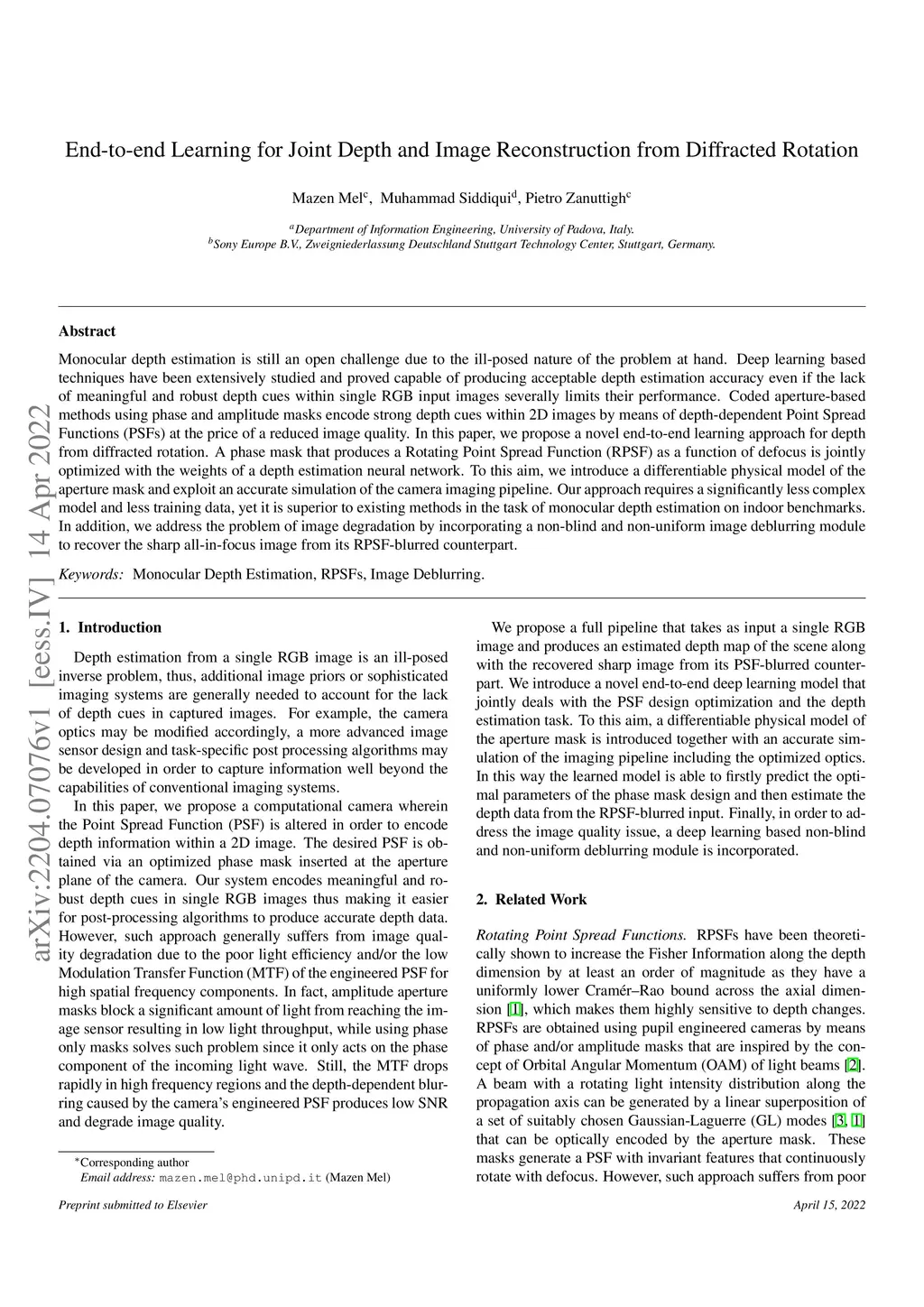 Monocular depth estimation is still an open challenge due to the ill-posed nature of the problem at hand. Deep learning based techniques have been extensively studied and proved capable of producing acceptable depth estimation accuracy even if the lack of meaningful and robust depth cues within single RGB input images severally limits their performance. Coded aperture-based methods using phase and amplitude masks encode strong depth cues within 2D images by means of depth-dependent Point Spread Functions (PSFs) at the price of a reduced image quality. In this paper, we propose a novel end-to-end learning approach for depth from diffracted rotation. A phase mask that produces a Rotating Point Spread Function (RPSF) as a function of defocus is jointly optimized with the weights of a depth estimation neural network. To this aim, we introduce a differentiable physical model of the aperture mask and exploit an accurate simulation of the camera imaging pipeline. Our approach requires a significantly less complex model and less training data, yet it is superior to existing methods in the task of monocular depth estimation on indoor benchmarks. In addition, we address the problem of image degradation by incorporating a non-blind and non-uniform image deblurring module to recover the sharp all-in-focus image from its RPSF-blurred counterpart.