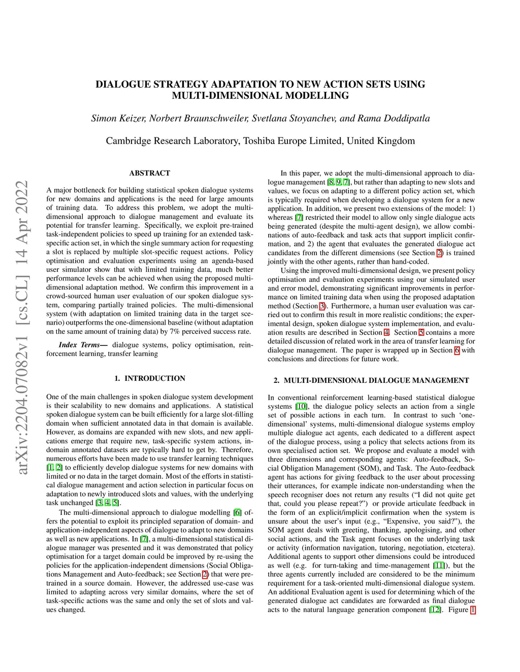 A major bottleneck for building statistical spoken dialogue systems for new domains and applications is the need for large amounts of training data. To address this problem, we adopt the multi-dimensional approach to dialogue management and evaluate its potential for transfer learning. Specifically, we exploit pre-trained task-independent policies to speed up training for an extended task-specific action set, in which the single summary action for requesting a slot is replaced by multiple slot-specific request actions. Policy optimisation and evaluation experiments using an agenda-based user simulator show that with limited training data, much better performance levels can be achieved when using the proposed multi-dimensional adaptation method. We confirm this improvement in a crowd-sourced human user evaluation of our spoken dialogue system, comparing partially trained policies. The multi-dimensional system (with adaptation on limited training data in the target scenario) outperforms the one-dimensional baseline (without adaptation on the same amount of training data) by 7% perceived success rate.