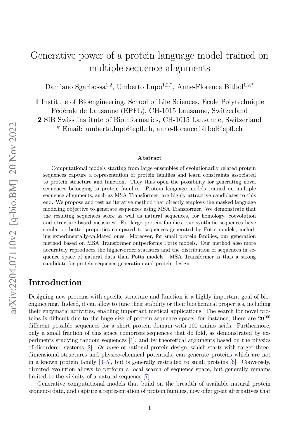 Computational models starting from large ensembles of evolutionarily related protein sequences capture a representation of protein families and learn constraints associated to protein structure and function. They thus open the possibility for generating novel sequences belonging to protein families. Protein language models trained on multiple sequence alignments, such as MSA Transformer, are highly attractive candidates to this end. We propose and test an iterative method that directly employs the masked language modeling objective to generate sequences using MSA Transformer. We demonstrate that the resulting sequences score as well as natural sequences, for homology, coevolution and structure-based measures. For large protein families, our synthetic sequences have similar or better properties compared to sequences generated by Potts models, including experimentally-validated ones. Moreover, for small protein families, our generation method based on MSA Transformer outperforms Potts models. Our method also more accurately reproduces the higher-order statistics and the distribution of sequences in sequence space of natural data than Potts models. MSA Transformer is thus a strong candidate for protein sequence generation and protein design.