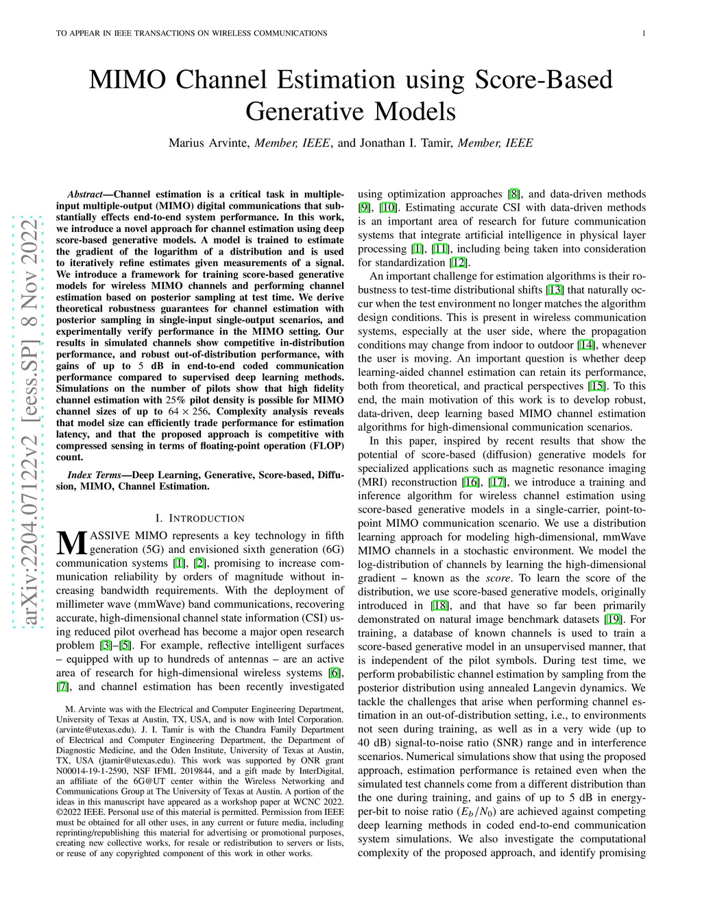 Channel estimation is a critical task in multiple-input multiple-output (MIMO) digital communications that substantially effects end-to-end system performance. In this work, we introduce a novel approach for channel estimation using deep score-based generative models. A model is trained to estimate the gradient of the logarithm of a distribution and is used to iteratively refine estimates given measurements of a signal. We introduce a framework for training score-based generative models for wireless MIMO channels and performing channel estimation based on posterior sampling at test time. We derive theoretical robustness guarantees for channel estimation with posterior sampling in single-input single-output scenarios, and experimentally verify performance in the MIMO setting. Our results in simulated channels show competitive in-distribution performance, and robust out-of-distribution performance, with gains of up to dB in end-to-end coded communication performance compared to supervised deep learning methods. Simulations on the number of pilots show that high fidelity channel estimation with % pilot density is possible for MIMO channel sizes of up to . Complexity analysis reveals that model size can efficiently trade performance for estimation latency, and that the proposed approach is competitive with compressed sensing in terms of floating-point operation (FLOP) count.