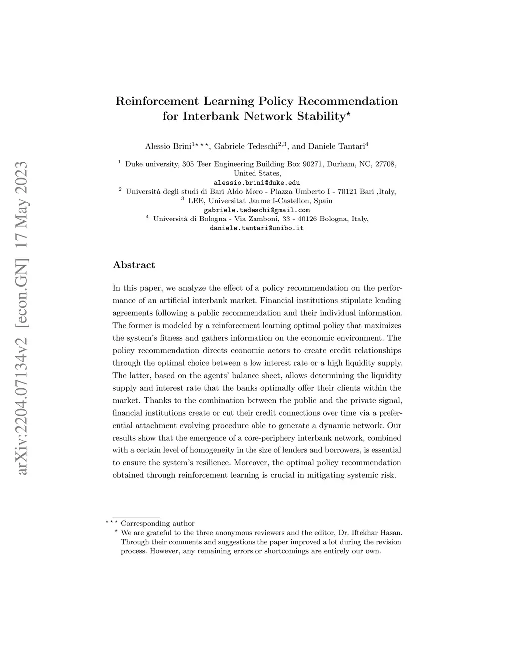 Reinforcement Learning Policy Recommendation for Interbank Network