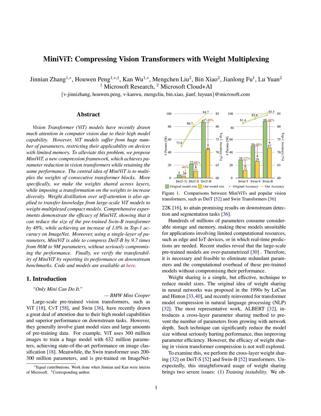 Vision Transformer (ViT) models have recently drawn much attention in computer vision due to their high model capability. However, ViT models suffer from huge number of parameters, restricting their applicability on devices with limited memory. To alleviate this problem, we propose MiniViT, a new compression framework, which achieves parameter reduction in vision transformers while retaining the same performance. The central idea of MiniViT is to multiplex the weights of consecutive transformer blocks. More specifically, we make the weights shared across layers, while imposing a transformation on the weights to increase diversity. Weight distillation over self-attention is also applied to transfer knowledge from large-scale ViT models to weight-multiplexed compact models. Comprehensive experiments demonstrate the efficacy of MiniViT, showing that it can reduce the size of the pre-trained Swin-B transformer by 48\%, while achieving an increase of 1.0\% in Top-1 accuracy on ImageNet. Moreover, using a single-layer of parameters, MiniViT is able to compress DeiT-B by 9.7 times from 86M to 9M parameters, without seriously compromising the performance. Finally, we verify the transferability of MiniViT by reporting its performance on downstream benchmarks. Code and models are available at here.