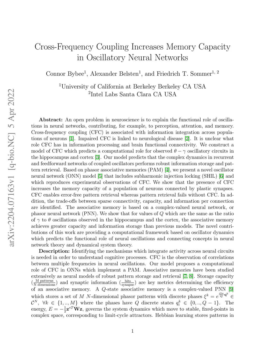 An open problem in neuroscience is to explain the functional role of oscillations in neural networks, contributing, for example, to perception, attention, and memory. Cross-frequency coupling (CFC) is associated with information integration across populations of neurons. Impaired CFC is linked to neurological disease. It is unclear what role CFC has in information processing and brain functional connectivity. We construct a model of CFC which predicts a computational role for observed oscillatory circuits in the hippocampus and cortex. Our model predicts that the complex dynamics in recurrent and feedforward networks of coupled oscillators performs robust information storage and pattern retrieval. Based on phasor associative memories (PAM), we present a novel oscillator neural network (ONN) model that includes subharmonic injection locking (SHIL) and which reproduces experimental observations of CFC. We show that the presence of CFC increases the memory capacity of a population of neurons connected by plastic synapses. CFC enables error-free pattern retrieval whereas pattern retrieval fails without CFC. In addition, the trade-offs between sparse connectivity, capacity, and information per connection are identified. The associative memory is based on a complex-valued neural network, or phasor neural network (PNN). We show that for values of which are the same as the ratio of to oscillations observed in the hippocampus and the cortex, the associative memory achieves greater capacity and information storage than previous models. The novel contributions of this work are providing a computational framework based on oscillator dynamics which predicts the functional role of neural oscillations and connecting concepts in neural network theory and dynamical system theory.