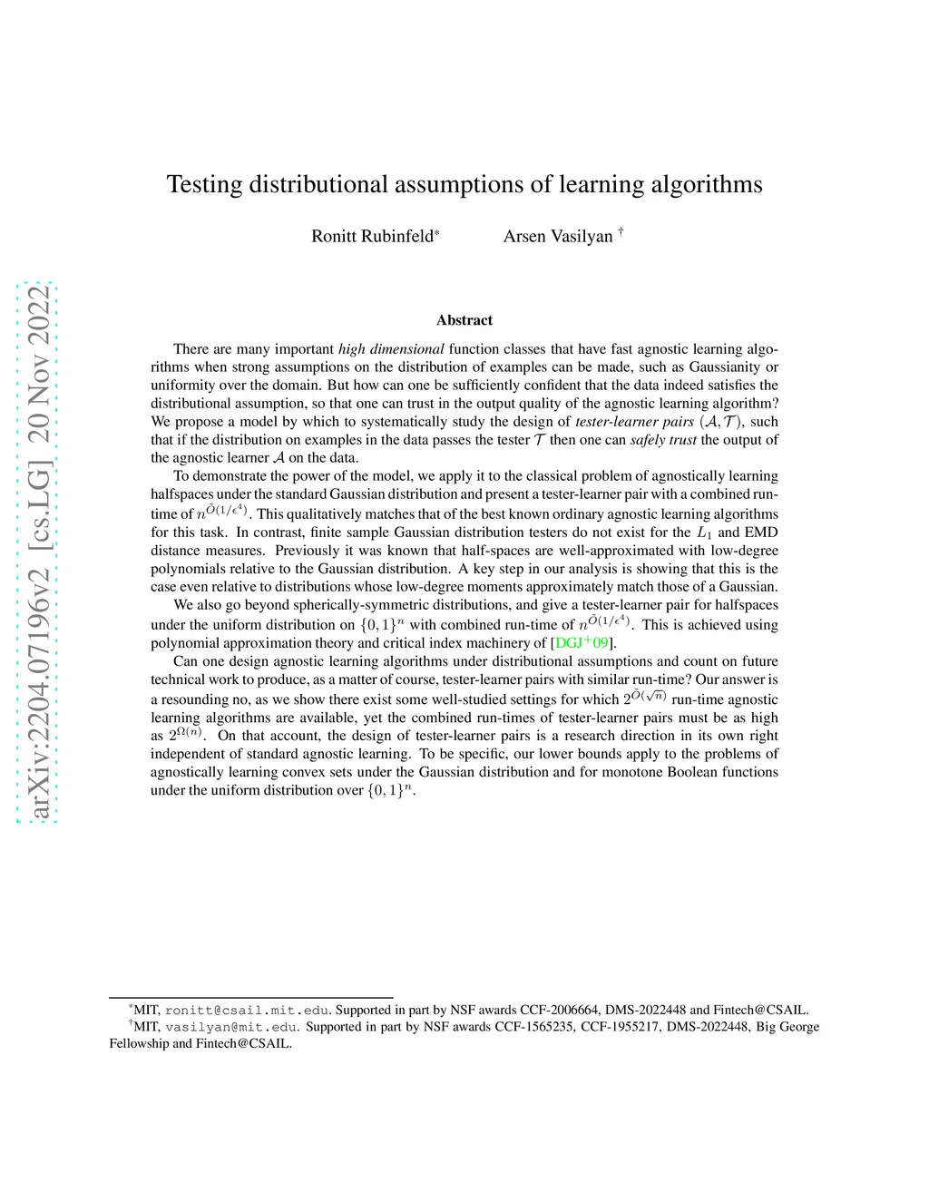 Testing distributional assumptions of learning algorithms