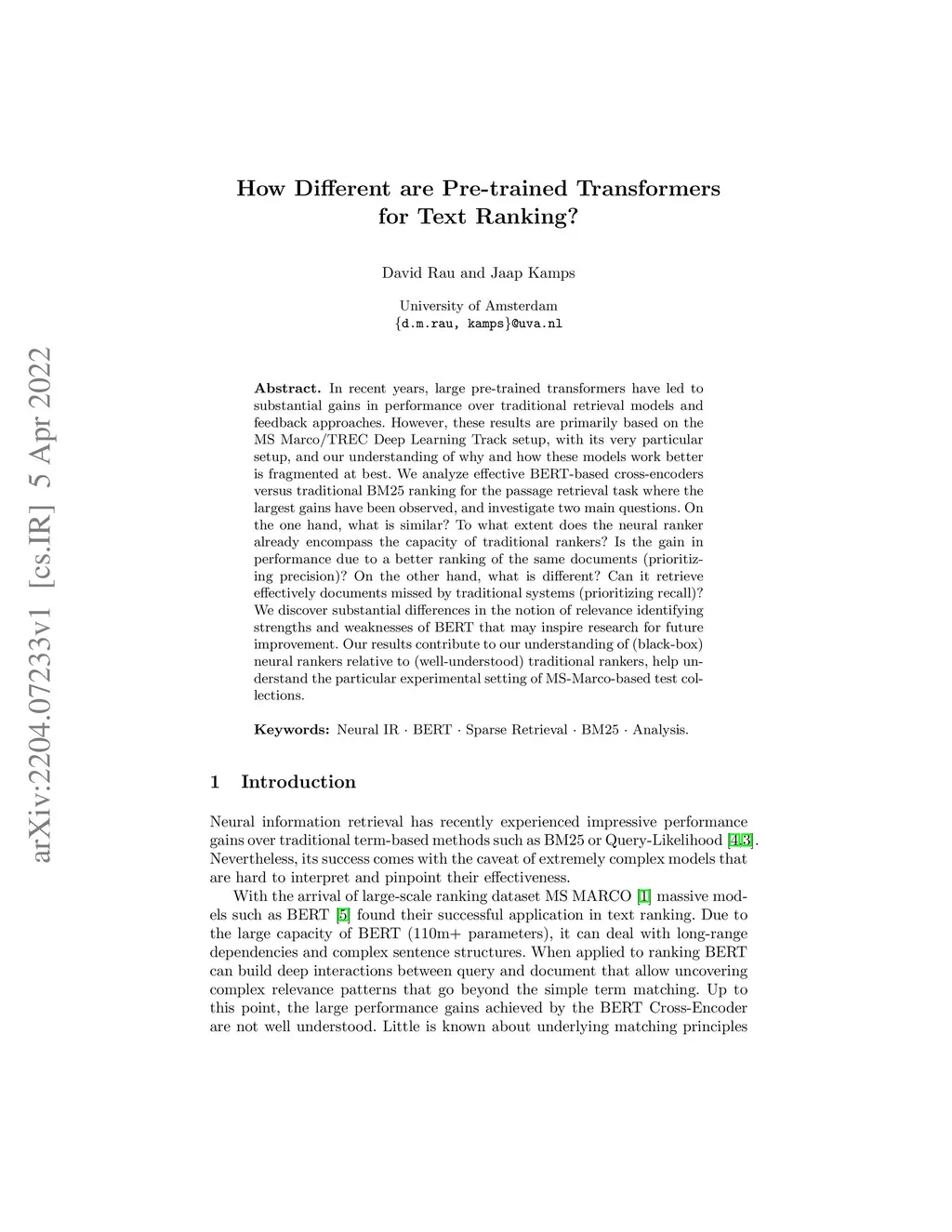 In recent years, large pre-trained transformers have led to substantial gains in performance over traditional retrieval models and feedback approaches. However, these results are primarily based on the MS Marco/TREC Deep Learning Track setup, with its very particular setup, and our understanding of why and how these models work better is fragmented at best. We analyze effective BERT-based cross-encoders versus traditional BM25 ranking for the passage retrieval task where the largest gains have been observed, and investigate two main questions. On the one hand, what is similar? To what extent does the neural ranker already encompass the capacity of traditional rankers? Is the gain in performance due to a better ranking of the same documents (prioritizing precision)? On the other hand, what is different? Can it retrieve effectively documents missed by traditional systems (prioritizing recall)? We discover substantial differences in the notion of relevance identifying strengths and weaknesses of BERT that may inspire research for future improvement. Our results contribute to our understanding of (black-box) neural rankers relative to (well-understood) traditional rankers, help understand the particular experimental setting of MS-Marco-based test collections.