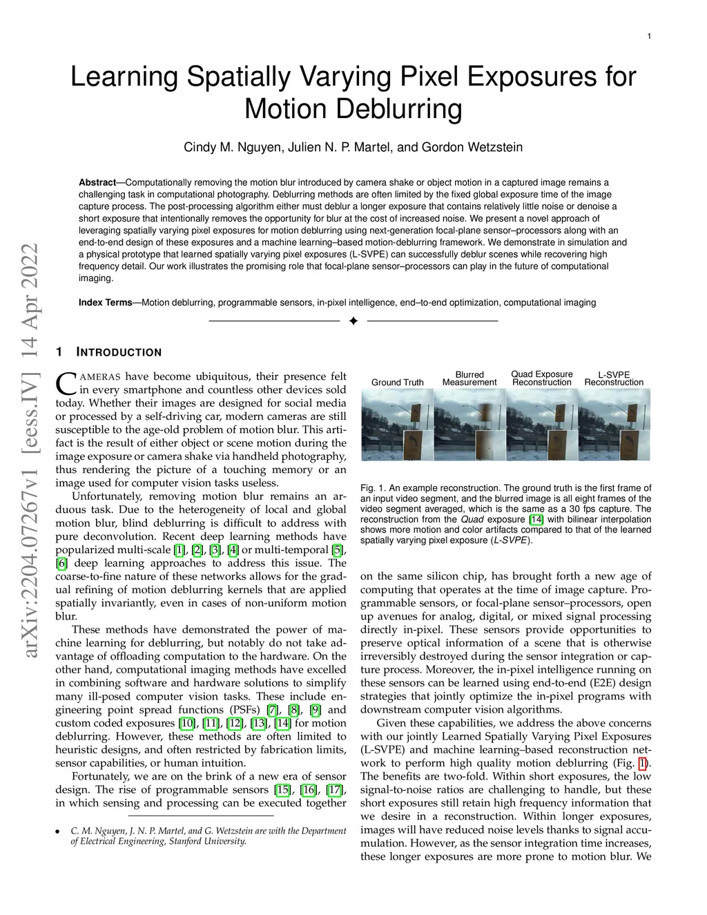 Computationally removing the motion blur introduced by camera shake or object motion in a captured image remains a challenging task in computational photography. Deblurring methods are often limited by the fixed global exposure time of the image capture process. The post-processing algorithm either must deblur a longer exposure that contains relatively little noise or denoise a short exposure that intentionally removes the opportunity for blur at the cost of increased noise. We present a novel approach of leveraging spatially varying pixel exposures for motion deblurring using next-generation focal-plane sensor--processors along with an end-to-end design of these exposures and a machine learning--based motion-deblurring framework. We demonstrate in simulation and a physical prototype that learned spatially varying pixel exposures (L-SVPE) can successfully deblur scenes while recovering high frequency detail. Our work illustrates the promising role that focal-plane sensor--processors can play in the future of computational imaging.