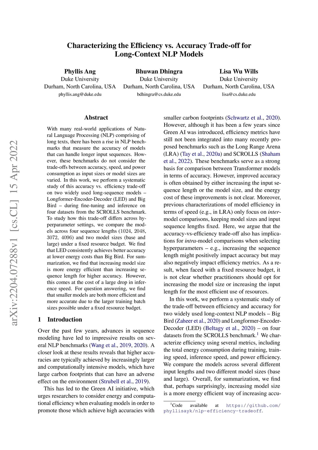 With many real-world applications of Natural Language Processing (NLP) comprising of long texts, there has been a rise in NLP benchmarks that measure the accuracy of models that can handle longer input sequences. However, these benchmarks do not consider the trade-offs between accuracy, speed, and power consumption as input sizes or model sizes are varied. In this work, we perform a systematic study of this accuracy vs. efficiency trade-off on two widely used long-sequence models - Longformer-Encoder-Decoder (LED) and Big Bird - during fine-tuning and inference on four datasets from the SCROLLS benchmark. To study how this trade-off differs across hyperparameter settings, we compare the models across four sequence lengths (1024, 2048, 3072, 4096) and two model sizes (base and large) under a fixed resource budget. We find that LED consistently achieves better accuracy at lower energy costs than Big Bird. For summarization, we find that increasing model size is more energy efficient than increasing sequence length for higher accuracy. However, this comes at the cost of a large drop in inference speed. For question answering, we find that smaller models are both more efficient and more accurate due to the larger training batch sizes possible under a fixed resource budget.